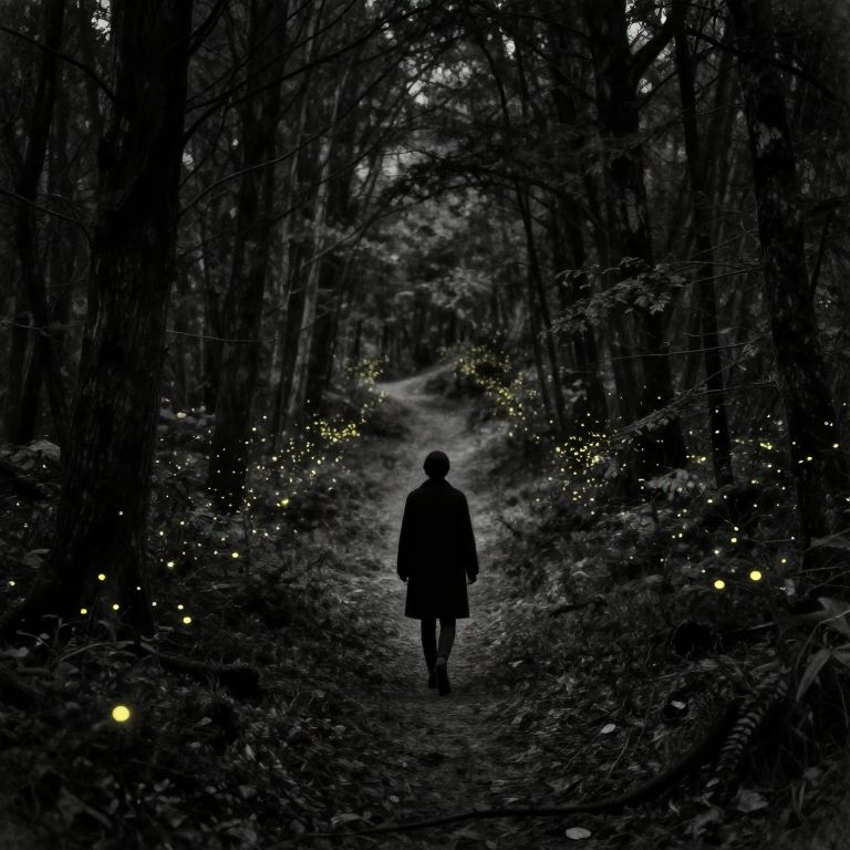 A lone figure in a sleek, black coat traverses a dense forest, illuminated by the gentle glow of fireflies. The scene captures an enigmatic aura as the protagonist moves through the shadows, reminiscent of a haunting charcoal drawing that combines the emotional depth of chiaroscuro with the mystique of an unseen path. From an overhead view, we observe this solitary journey, emphasizing both the vastness of the dark woods and the solitude of the traveler. The ethereal lighting accentuates the rich textures of the forest floor, casting dramatic shadows that evoke a sense of intrigue and wonder, inviting viewers to ponder the unknown destination ahead.