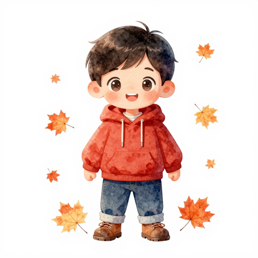 Watercolor sketch with subtle pastel tones full-body sticker of little Asian toddler boy with straight jet-black hair and a red hoodie wearing denim jeans and boots in cozy autumn park with orange maple leaves, white background, transparent PNG, neon highlights, upscaled, big sparkling eyes, cute smiling face