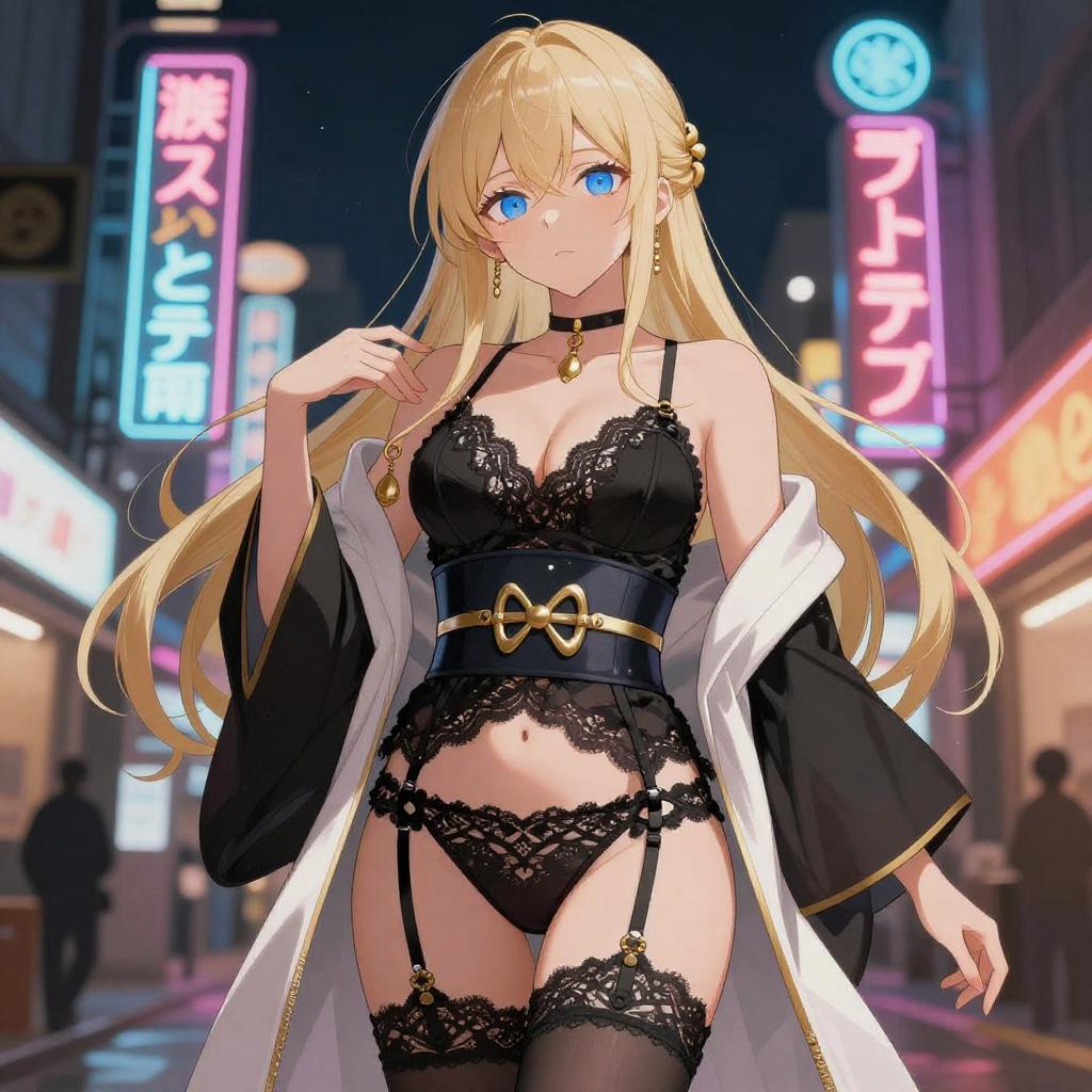 Digital art, blonde woman, blue eyes, long hair, black kimono, lace lingerie, garter belt, thigh-high stockings, neon signs, Japanese text, night scene, seductive pose, white robe, gold accessories, detailed background, anime style