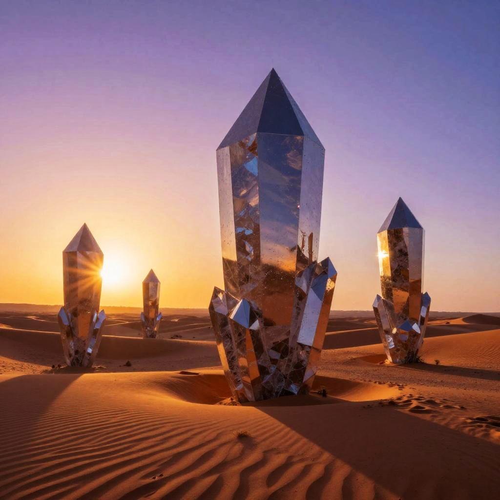 Brгјste in a surreal desert landscape at sunset, gigantic floating crystalline structures casting long shadows, soft sand dunes, vivid orange and purple sky, a sense of mystery and otherworldly beauty