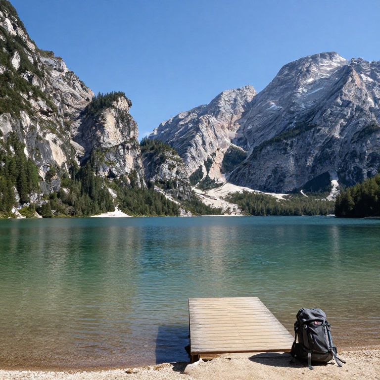 A peaceful mountain lake surrounded by towering peaks under a clear blue sky, with a small wooden dock and a hiker's backpack visible on the shore