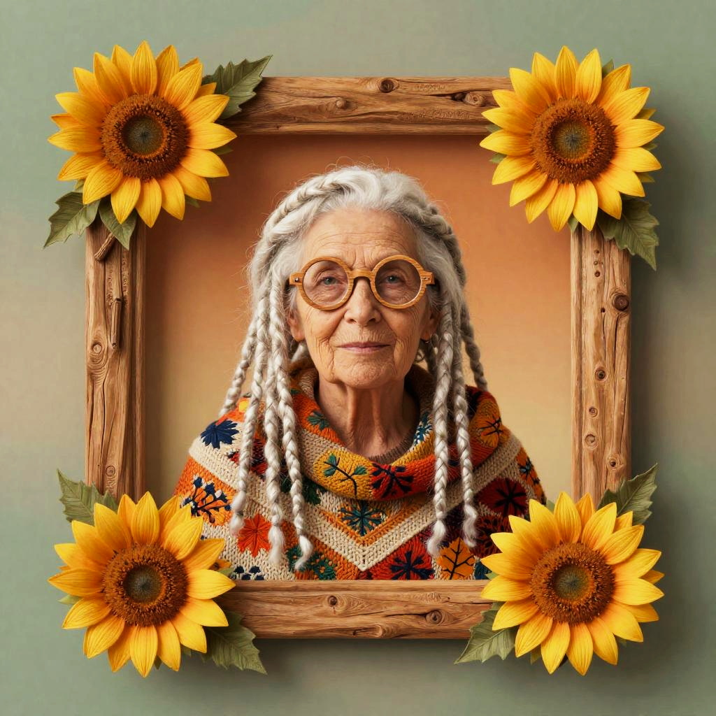 This digital artwork features a stylized portrait of elderly woman with platinum dreadlocks and round wooden spectacles, centered within a rustic oak rectangular frame adorned with carved sunflowers. A soft gradient background in warm ochre and faded green, gentle vignette, balanced symmetry. Wearing a hand-knitted wool shawl featuring autumn motifs. Modern and colorful fusion of folk art and contemporary design; crisp edges, subtle paper grain, painterly accents, high detail, studio quality.