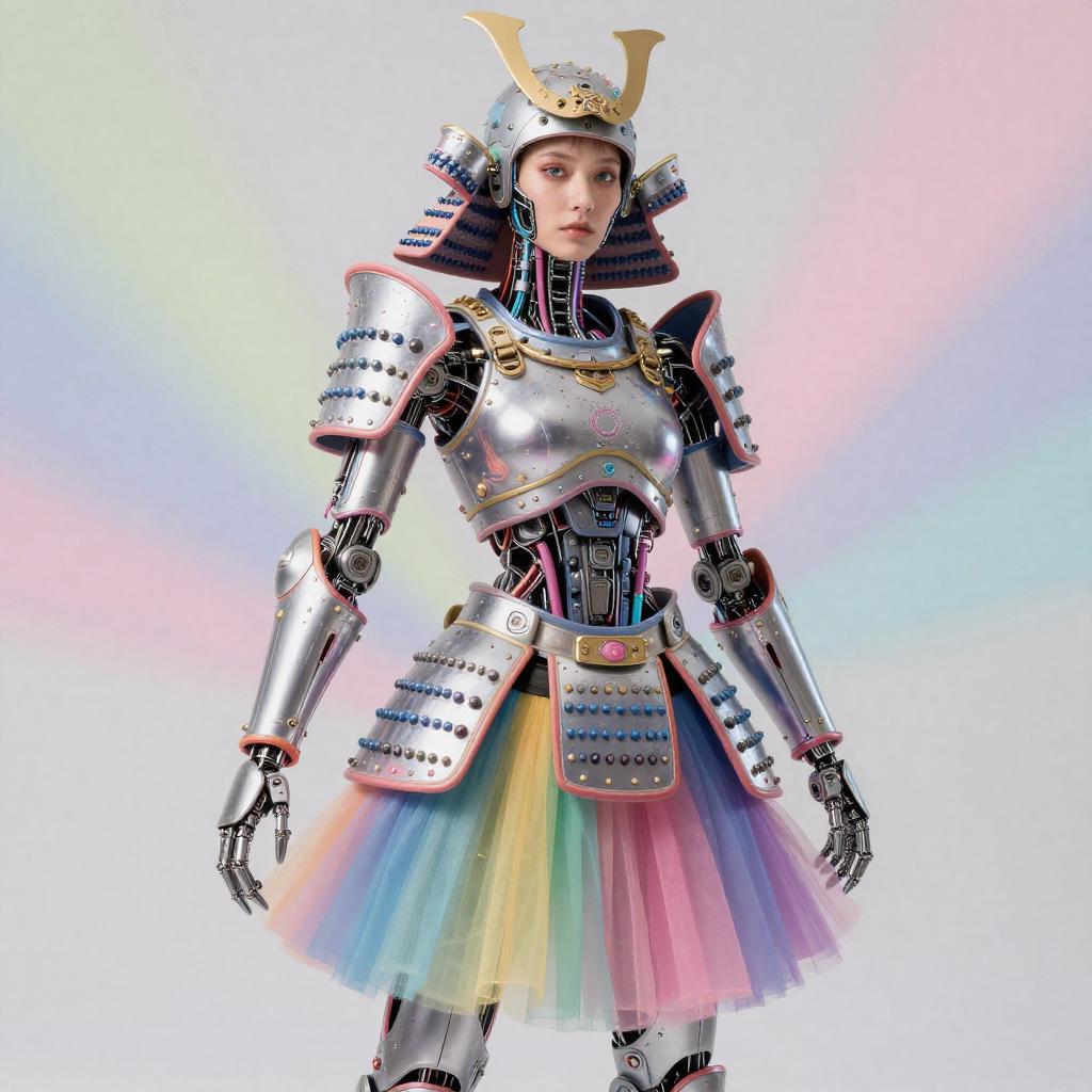 Realistic photo.Vibrant, colorful Niji pastel neon pop art in the style of Jimmy Marble, multi-colored tutu, female wired-cyborg with heavy armor resembling a feudal samurai, cyberpunk elements realistic photo