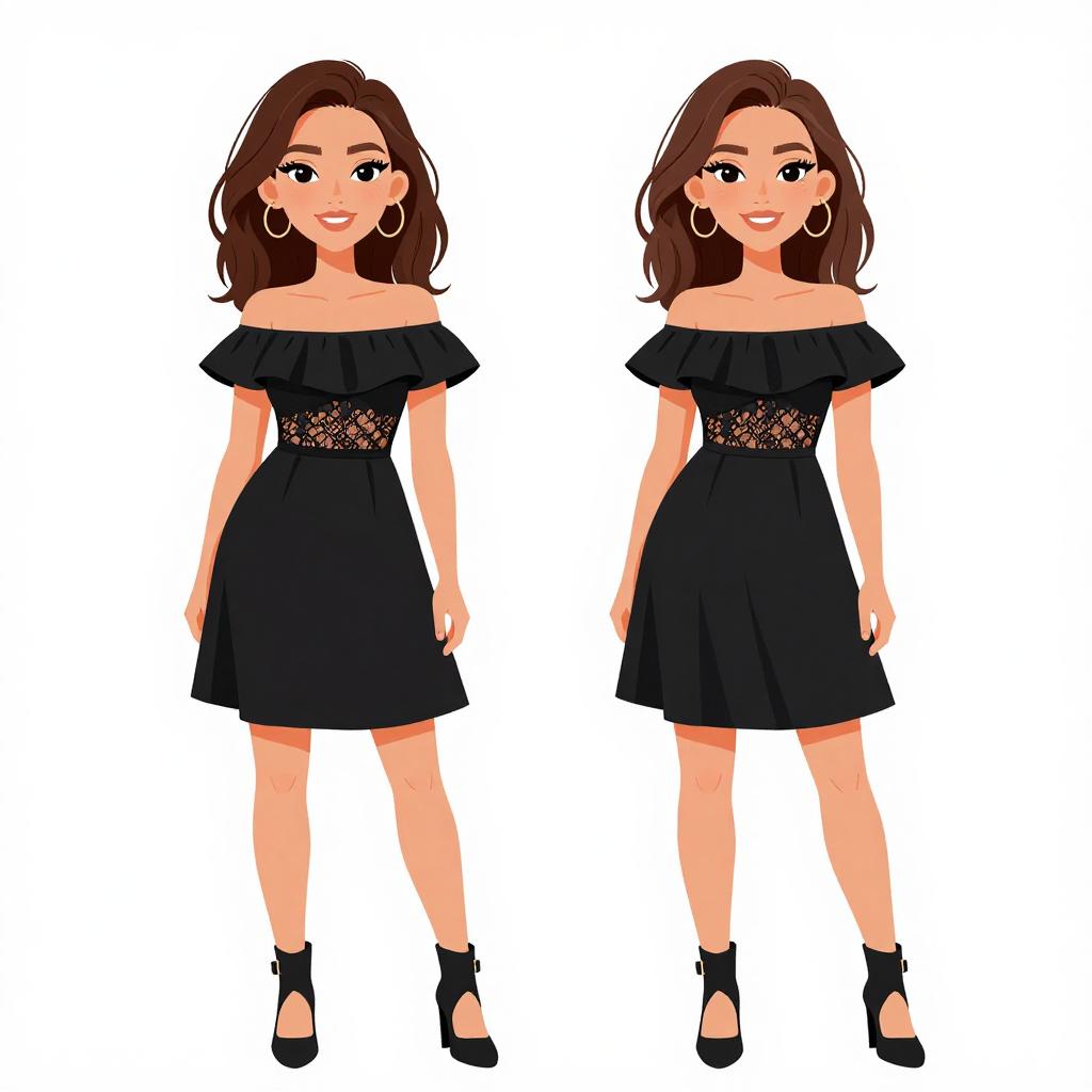 Woman with pretty face and pretty hair. smiling Woman, modern bohemian, off-the-shoulder mid-length dress in black, ruffled neckline, sheer lace midriff insert, A-line skirt, black ankle boots with cutouts and buckle straps, no visible jewelry, plain white studio background --sref 1467