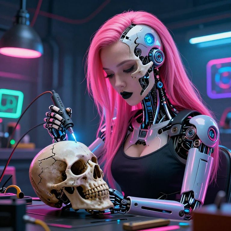 A half-body shot of a beautiful cyborg girl in her futuristic workshop, She has neon pink hair cascading down her shoulders, contrasting sharply with her black lipstick, The top of her face, from under the nose to the forehead, is removed like a mask, revealing a detailed mechanical skull underneath, With intense focus, she uses a glowing soldering iron to carefully repair the cracks on a detached skull, which rests in her other hand, Her exposed robotic eye glows a brilliant blue, illuminating the intricate cybernetic components beneath the skull, The workshop is cluttered with futuristic tools, wires, and neon-lit gadgets, all bathed in vibrant cyberpunk hue, electric pinks, deep blues, and fluorescent greens, The neon light reflects off her sleek metallic parts, casting dynamic shadows, while the scene radiates a blend of gritty industrial and high-tech futurism, The art style is highly detailed, in the vein of futurist anime, capturing the beauty of the cyborg girl and the mechanical complexity of her exposed skull