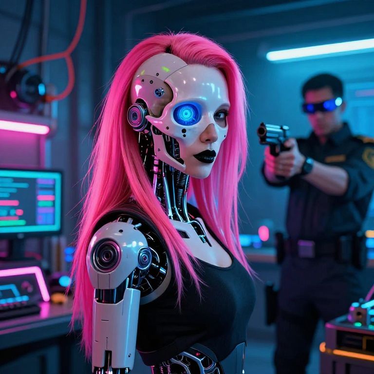 A hyper-realistic CGI image depicts a cybernetic woman with long, bright pink hair and pale skin, wearing a black tank top. She has robotic arms and neck, with glowing blue accents, and is holding a skull with a cracked surface. She is using a black corded device on the skull, which is placed on a dark, reflective surface. The background is a dimly lit, futuristic laboratory with neon lights in pink and blue. Her expression is focused and slightly melancholic. The scene combines elements of sci-fi and cyberpunk aesthetics.