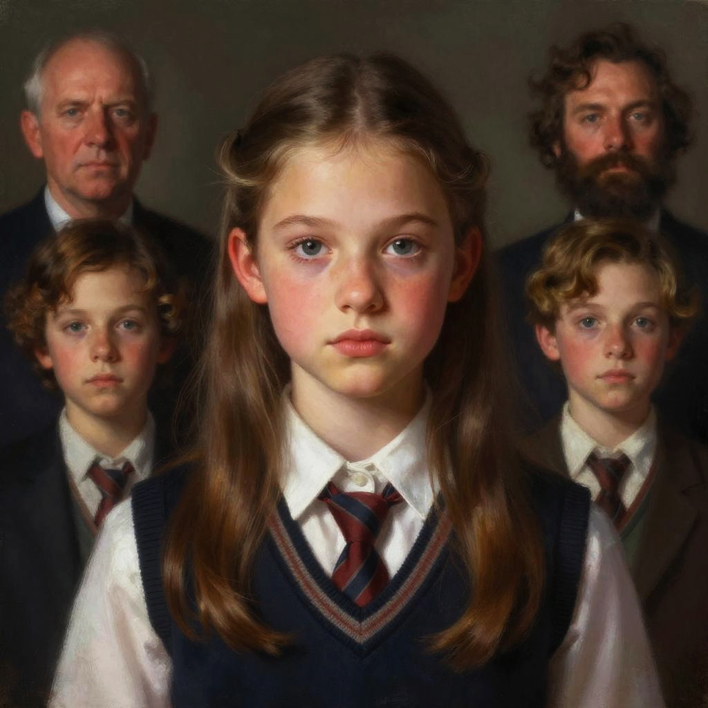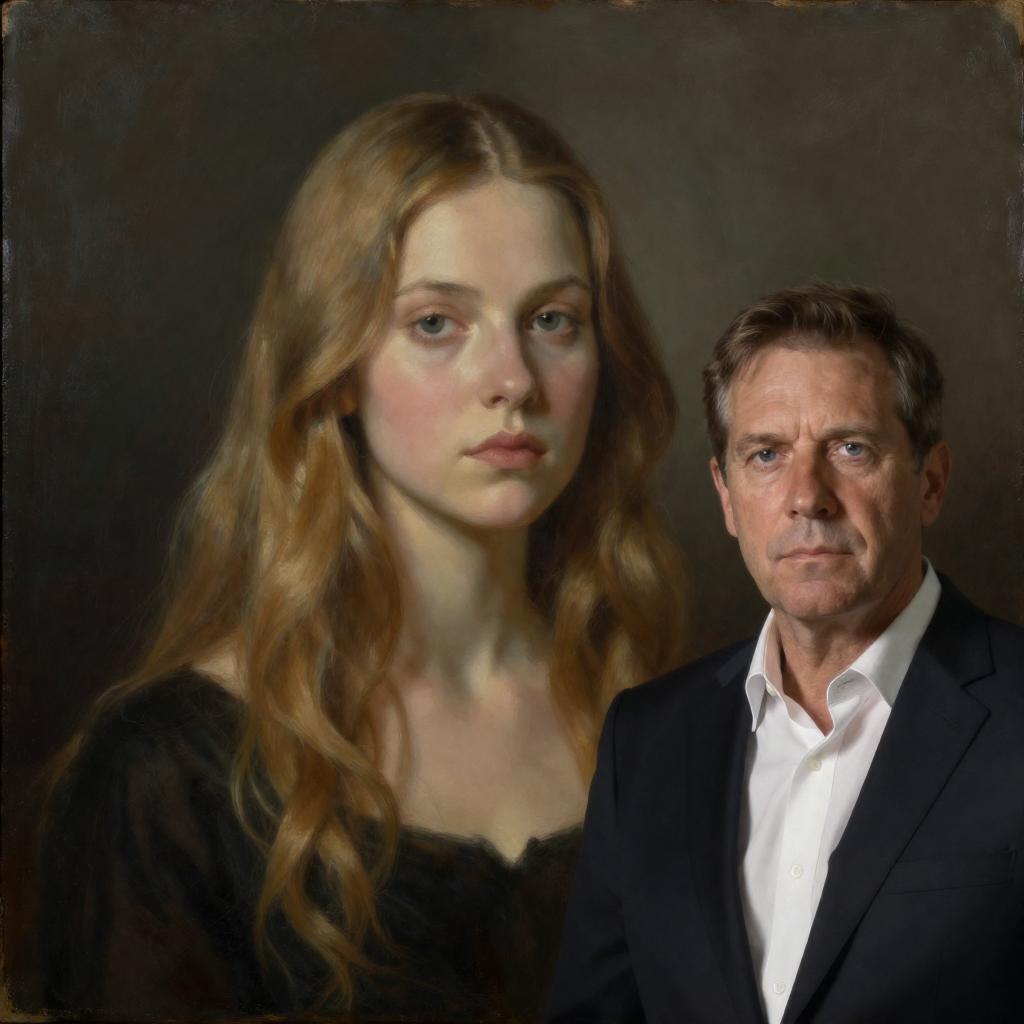 Photograph of a portrait painting of a young woman with long, wavy blonde hair, pale skin, and a serious expression, wearing a dark top. Next to the painting is a photograph of an older man with short brown hair, tanned skin, and a stern expression, wearing a dark suit and white shirt. Dark ured background.