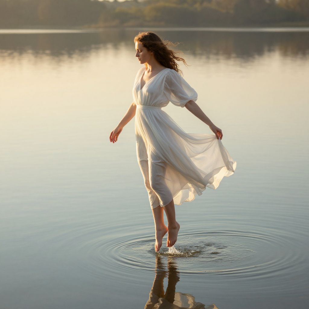Photograph of a woman with long brown hair, wearing a flowing white dress, standing barefoot in a calm lake at sunrise, ripples forming around