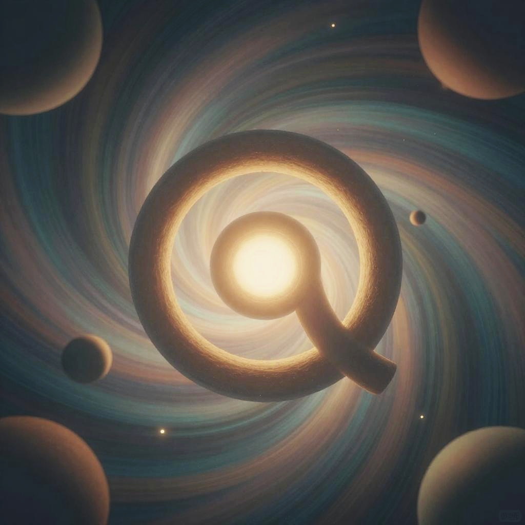 Digital art of a glowing, swirling galaxy with a central, fiery, circular object surrounded by planets and stars in a cosmic vortex.
