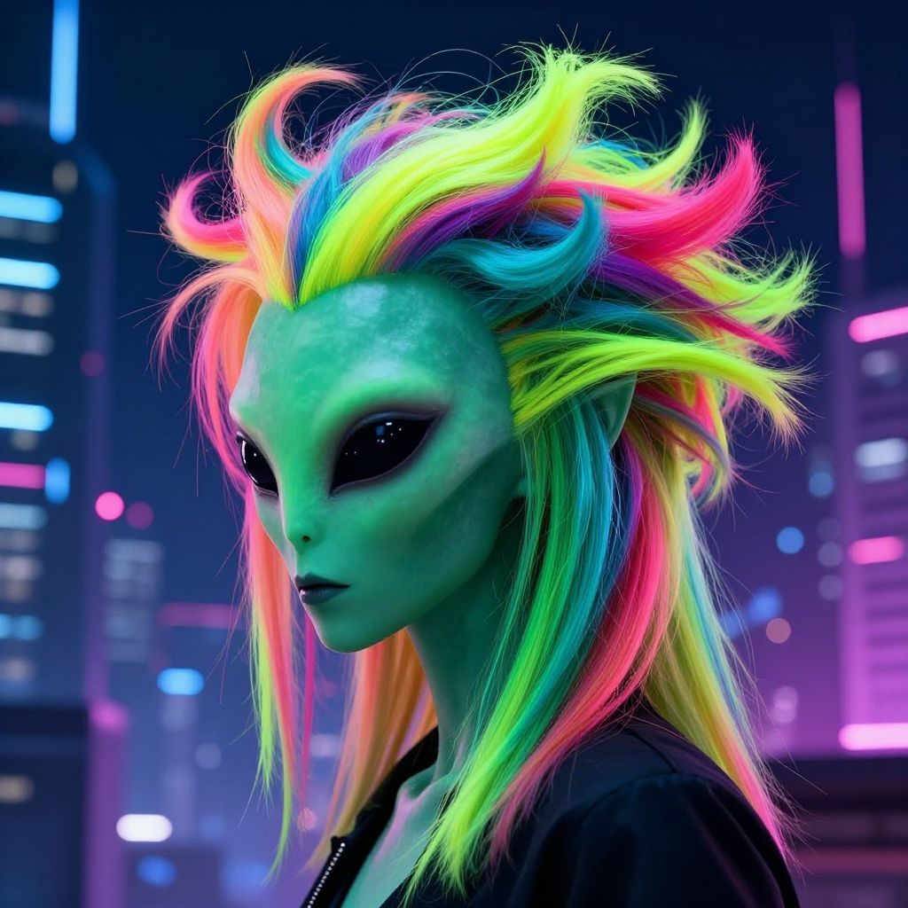 Alien hair style featuring vibrant neon colors, otherworldly textures, and gravity-defying shapes, set against a futuristic cityscape background with glowing lights.