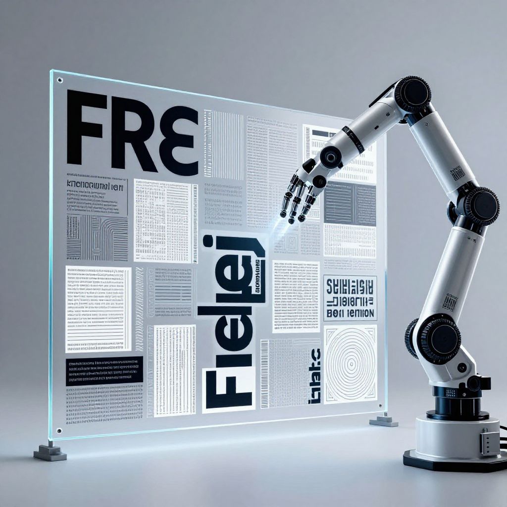 Free graphic design AI generating intricate patterns and bold typography on transparent screens, with a high-tech robotic arm assisting, highlighting seamless collaboration between human creativity and artificial intelligence in a minimalist, futuristic setting.