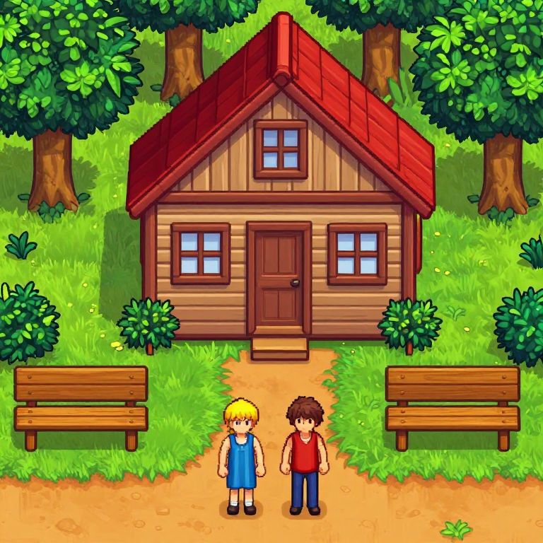 Two characters stand on a dirt path in front of a cozy wooden cabin with a red roof, surrounded by lush green trees and bushes, while a wooden bench rests nearby in the serene setting of Stardew Valley.