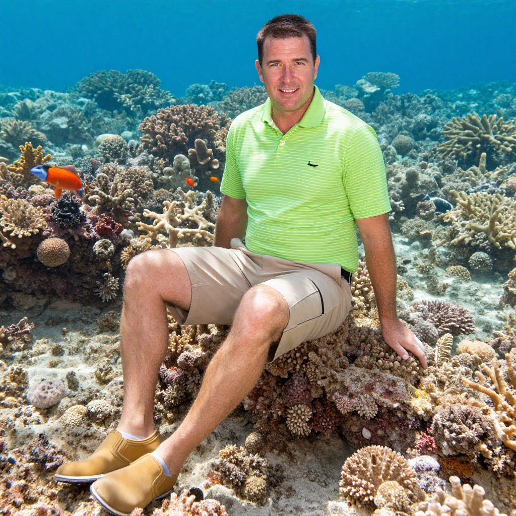 A man, bright green striped golf polo, khaki tech shorts, tan slip-on golf shoes, vibrant and fresh, colorful coral reefs, crystal-clear waters, camera obscura style, relaxed smile, enjoying the sun. Man has masculine face and piercing eyes