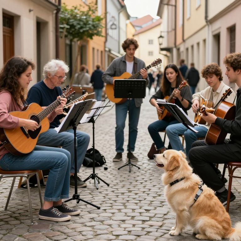 Harmony blooms amidst the cobblestones as music weaves a tapestry of connection, joy, and shared purpose, while the gentle presence of a loyal companion adds warmth to the timeless melody of community.