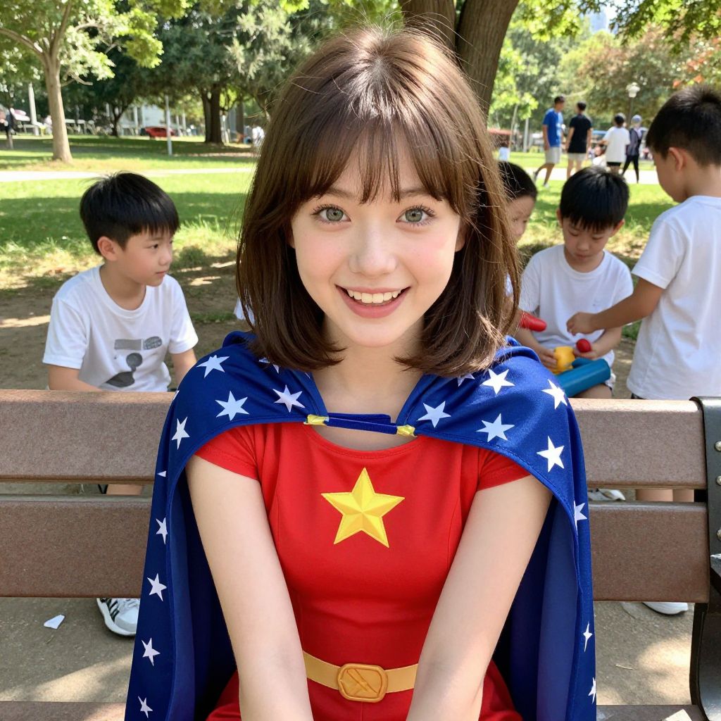 A cheerful high school girl with soft, layered bangs that gently frame her round face, wearing a playful superhero costume with a red suit and a star-patterned cape, sitting on a park bench during a sunny afternoon, surrounded by children playing nearby, her face has fair skin, bright green eyes, and a joyful, open expression, natural daylight, candid photography style