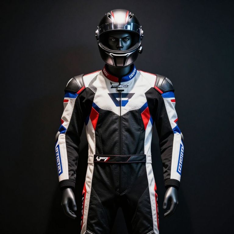 A mannequin wearing a detailed black, white, red, and blue racing suit with a polished metallic helmet on its head, standing rigidly in front of a solid, dark wall. The mannequin has a serious, intense expression, with sharp, angular features and a focused gaze, giving off a sense of determination and authority. The lighting is dramatic, with sharp contrasts and highlights on the suit's reflective surfaces, emphasizing the sleek, high-performance design. The background is a plain, featureless wall, creating a strong focal point that highlights the mannequin's bold, futuristic appearance.