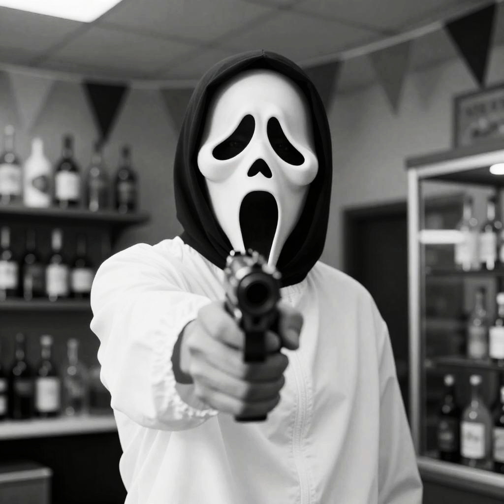 Photograph of a person in a white, full-face mask and hood, pointing a gun upwards. Background includes a mirrored wall reflecting the scene, shelves with Star Wars figures, and hanging banners. The person's face is obscured by the mask.