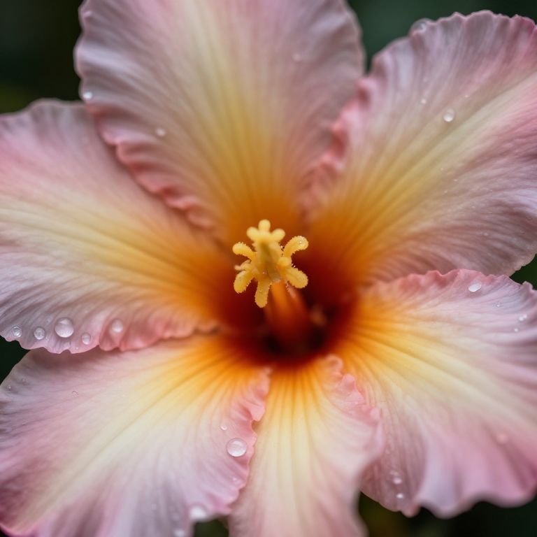 Close-up photograph of a delicate hibiscus flower with translucent pink petals tinged with white and yellow near the center. The flower's central stamen is bright yellow and surrounded by a vibrant orange core. Tiny water droplets rest on the petals, catching the light and adding a glistening effect. The background is dark and blurred, emphasizing the flower's intricate details and soft, delicate textures. The image is highly detailed, showcasing the flower's natural beauty and delicate structure.