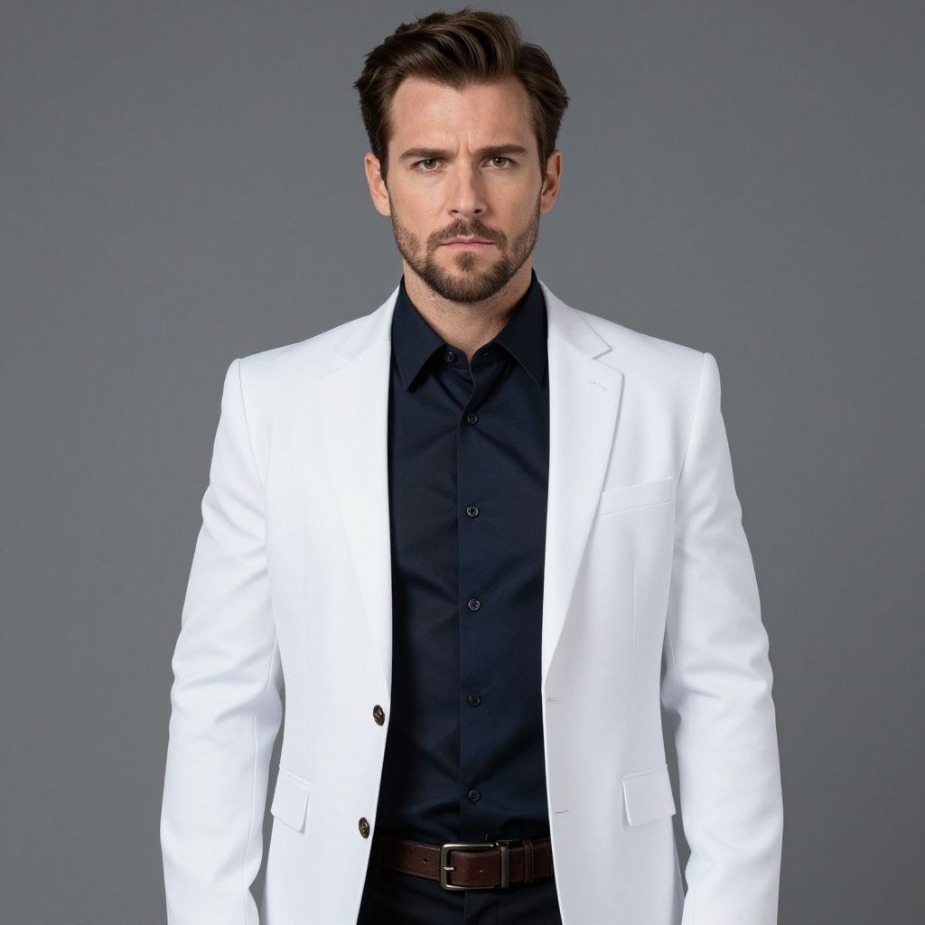 Photograph of a handsome, bearded Caucasian man with short, dark brown hair and a well-groomed beard. He has a serious expression and is wearing a sharp, white tailored suit jacket over a black dress shirt, buttoned to the top. The suit jacket has black buttons and a black belt with a rectangular buckle. The background is a plain, solid gray, emphasizing the subject. The lighting is even, highlighting the contrast between his white jacket and black shirt. His overall look is stylish and formal.