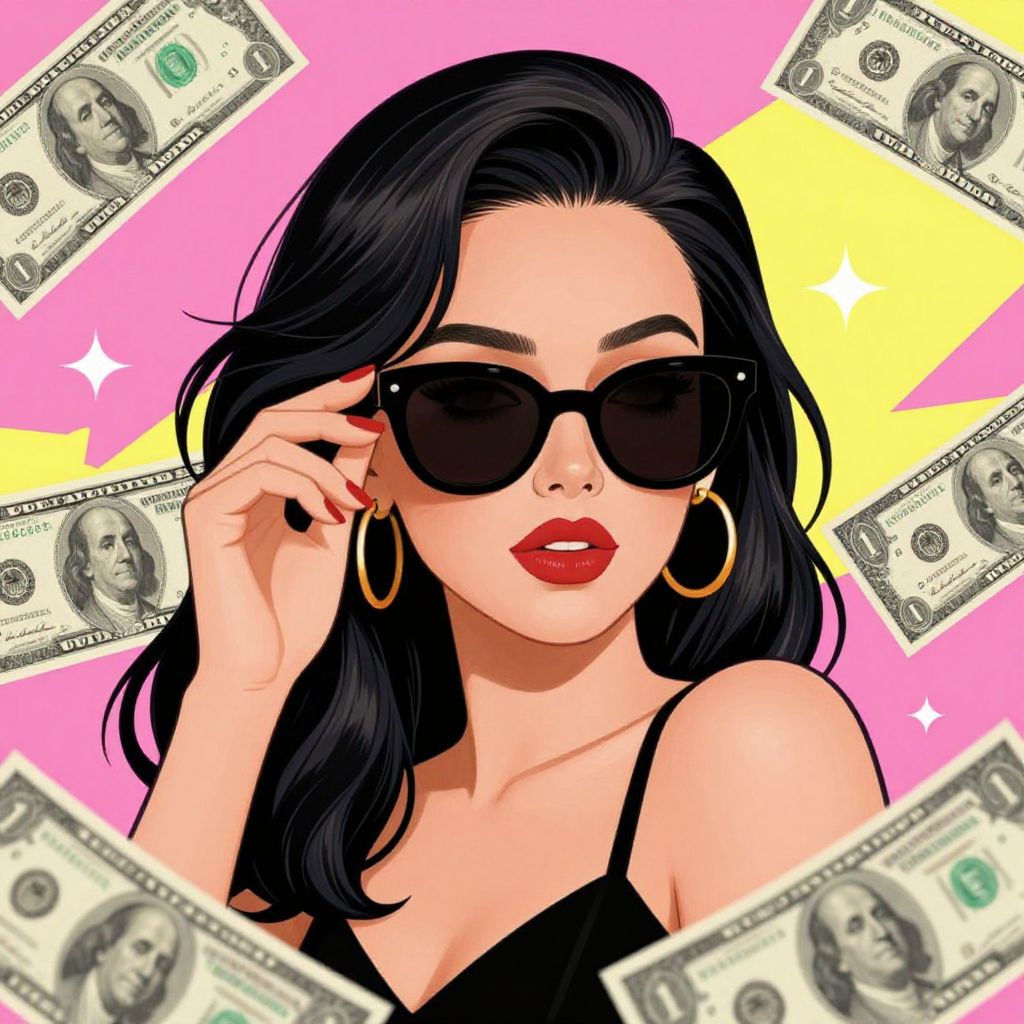 A vibrant pop art illustration of a woman in sunglasses, surrounded by dollar bills, exuding elegance and modernity.