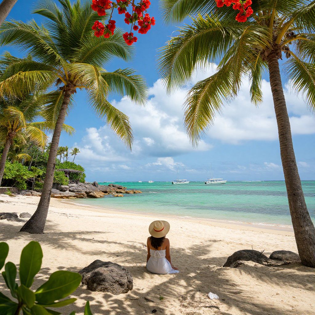 Photograph of a woman in a white dress and straw hat, sitting on a sunny, tropical beach with red flowers, palm trees, and calm turquoise