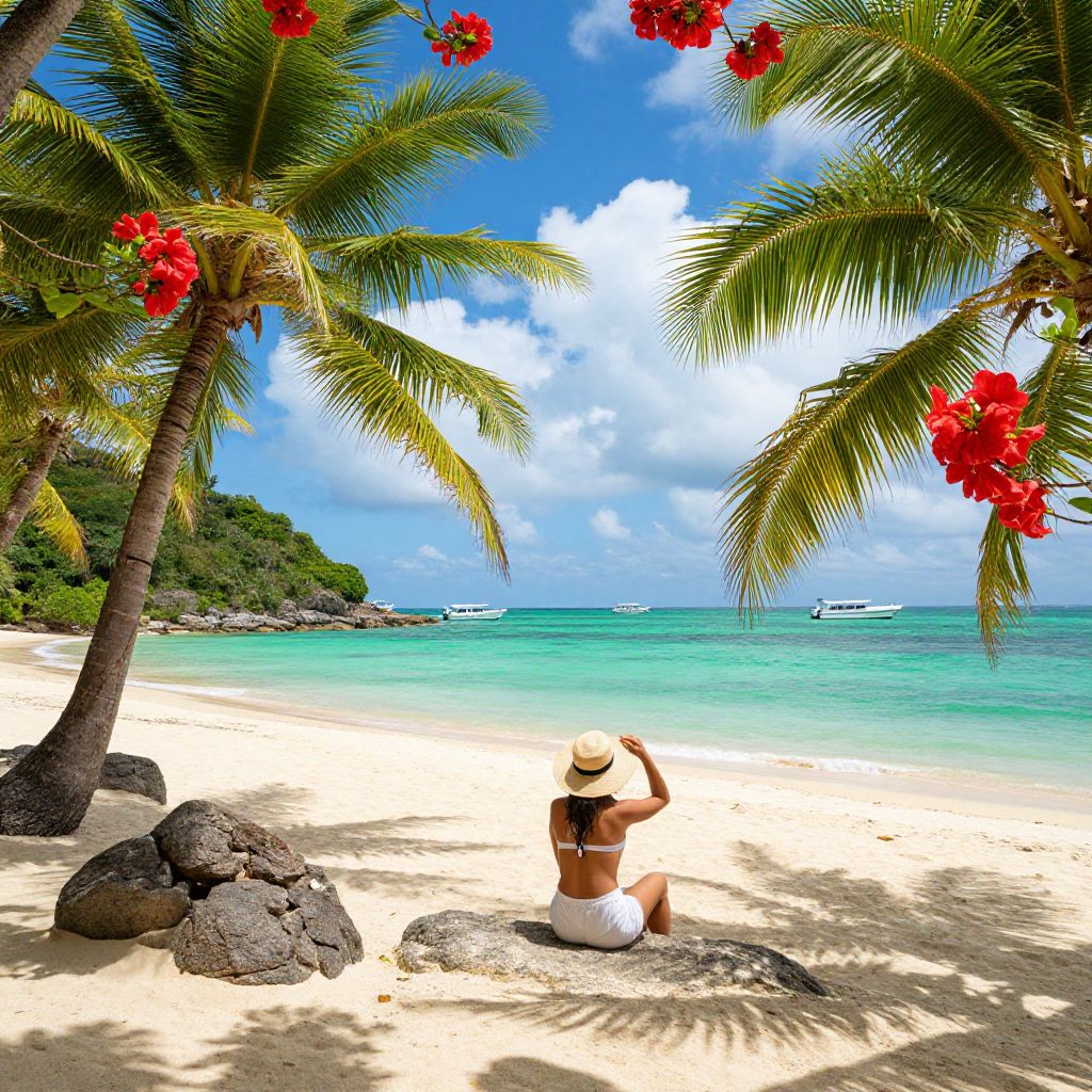 Tropical paradise unfolds with vibrant red flowers framing a serene beach where a woman in a straw hat sits contemplatively, surrounded by lush palm trees, rocky outcrops, and a turquoise sea dotted with boats, under a bright blue sky with fluffy clouds.