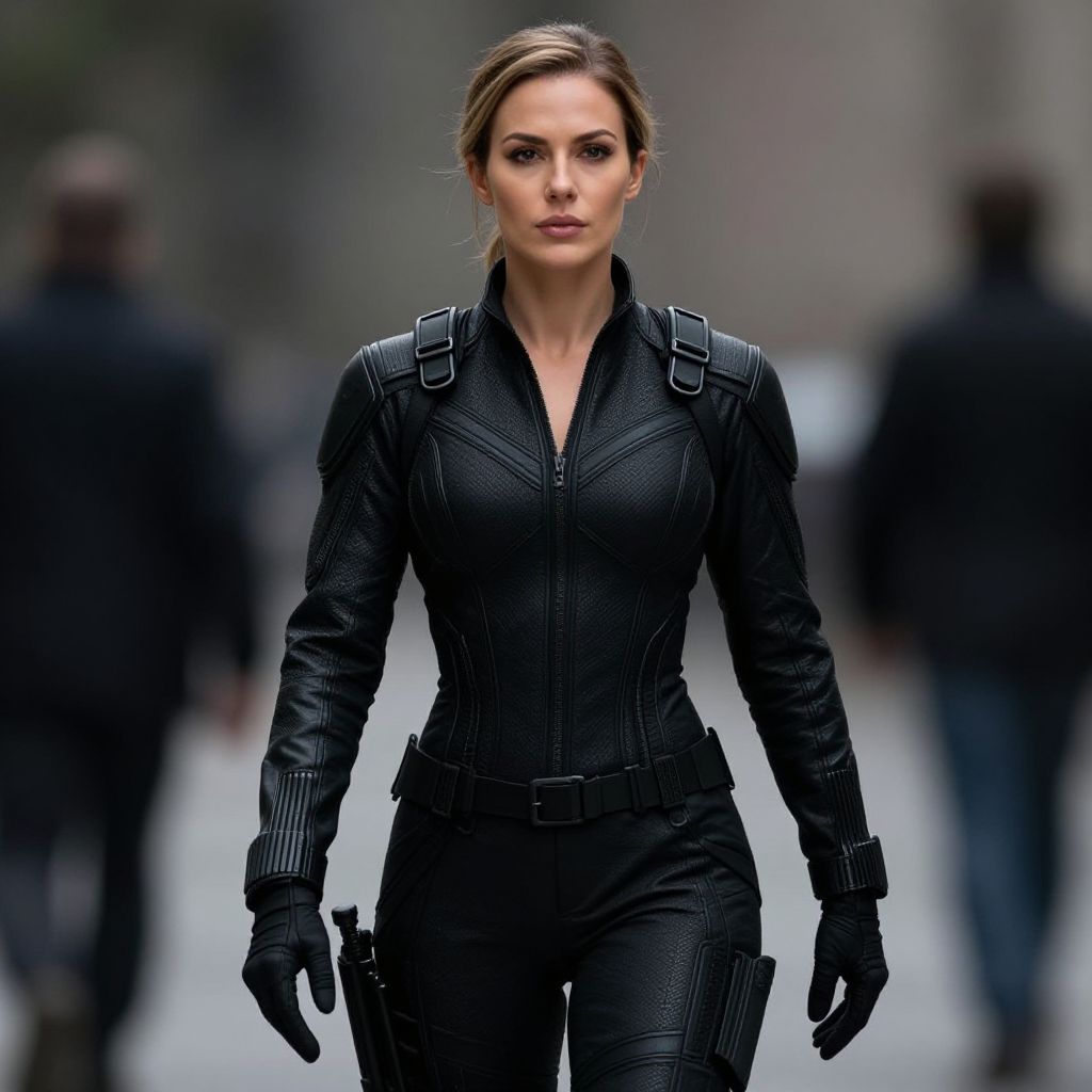Photograph of a serious-looking, blonde woman in a sleek, black leather bodysuit with tactical gloves, standing confidently in a blurred urban background.
