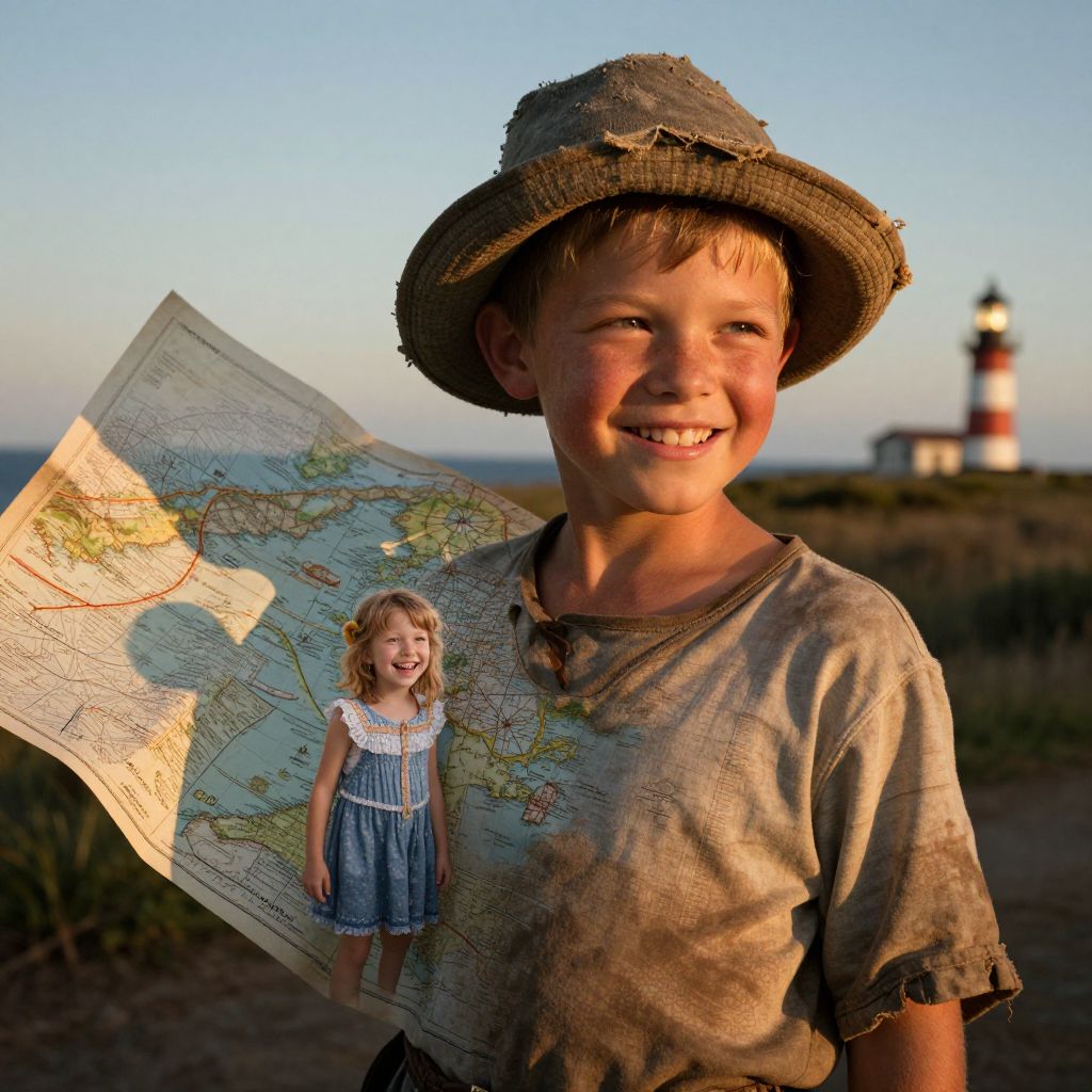 Photograph of a young boy with light brown hair, smiling, wearing a dirty, worn-out grey t-shirt and a brown straw hat with frayed edges. He holds a large, detailed map in his left hand, featuring a small, superimposed image of a blonde girl in a blue and white striped dress. The background shows a coastal landscape with a lighthouse in the distance, bathed in the warm golden light of sunset. The sky is clear with a gradient from blue to orange near the horizon. The boy's shirt and hat are visibly worn, suggesting outdoor activity.