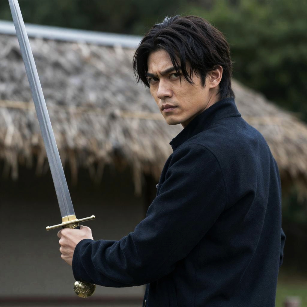 Man with dark hair, holding a sword in his right hand, looking over his shoulder with a determined expression. Wearing a dark jacket, standing in front of a thatched roof. Green foliage in the background. Photographed from the waist up.