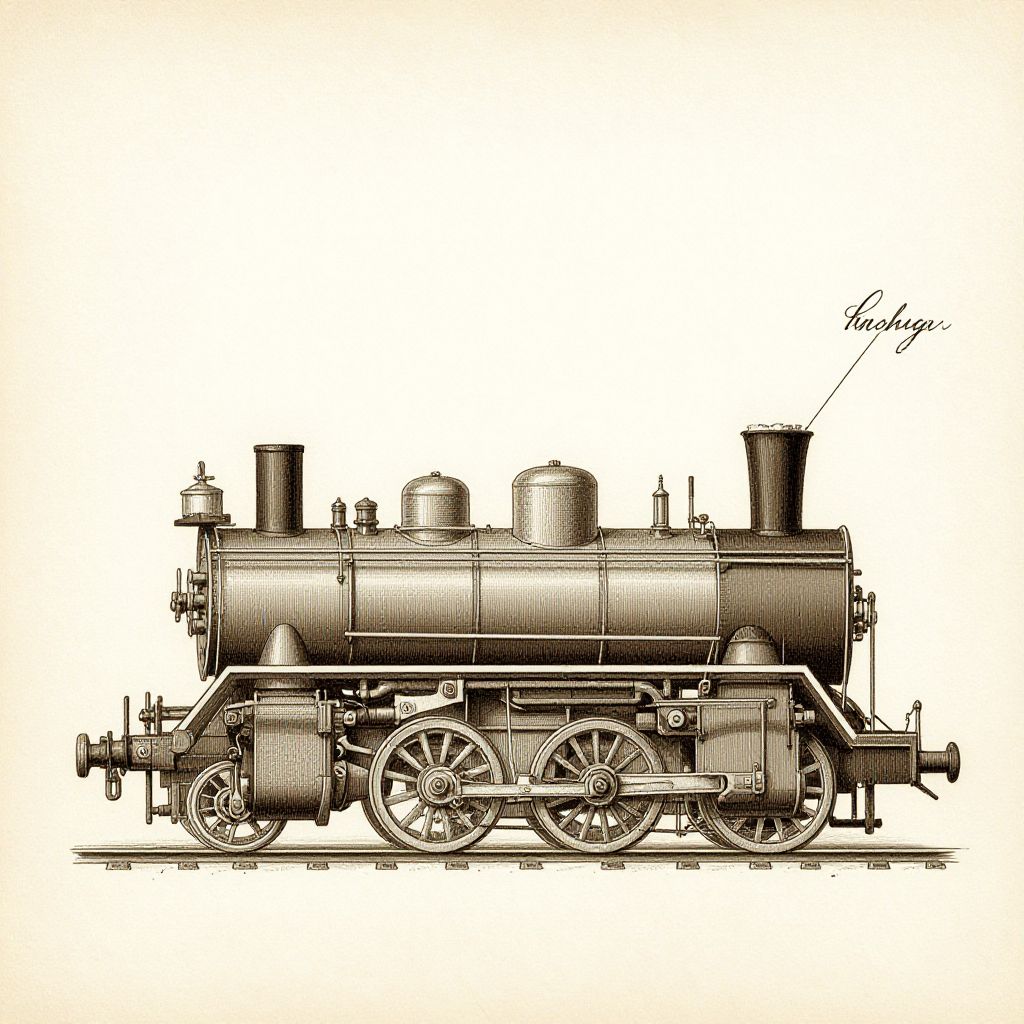 Annotated diagram of a vintage steam engine train, detailed mechanical parts labeled with elegant calligraphy, warm sepia tones and textured paper background, combining historical and technical illustration style for educational purposes.