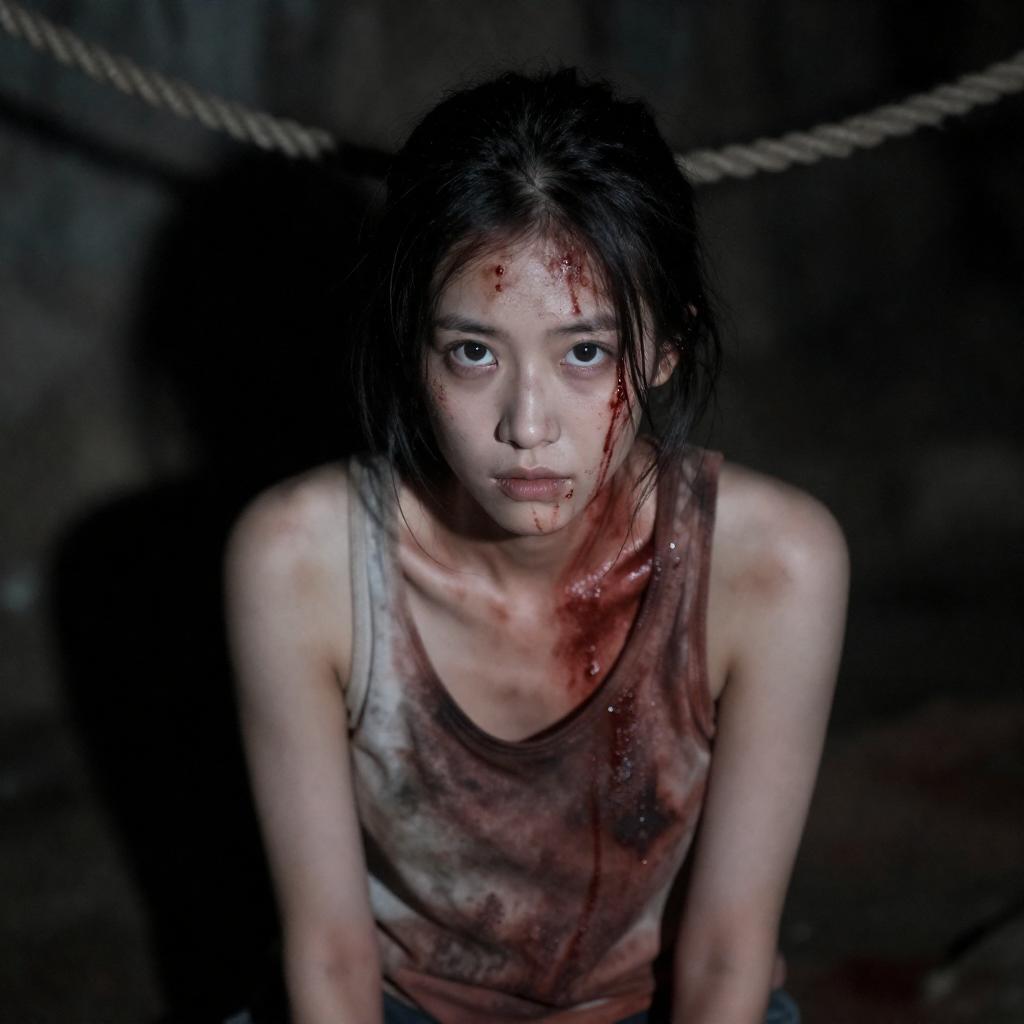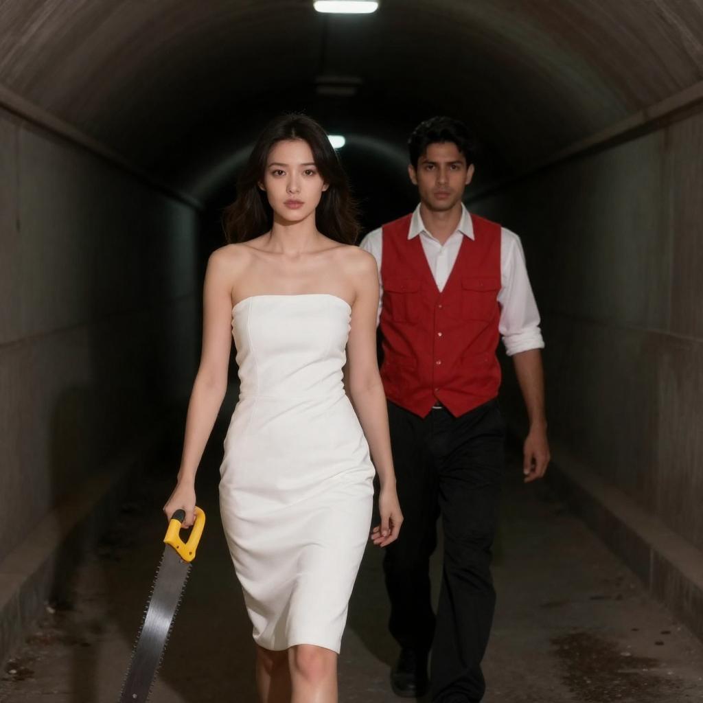 Photograph of a dark tunnel with dim lighting. A man in a white shirt, red vest, and black pants walks behind a woman in a strapless white dress, holding a large saw. Both have serious expressions. The tunnel has arched walls and a wet floor. The woman is in the foreground, the man in the background.