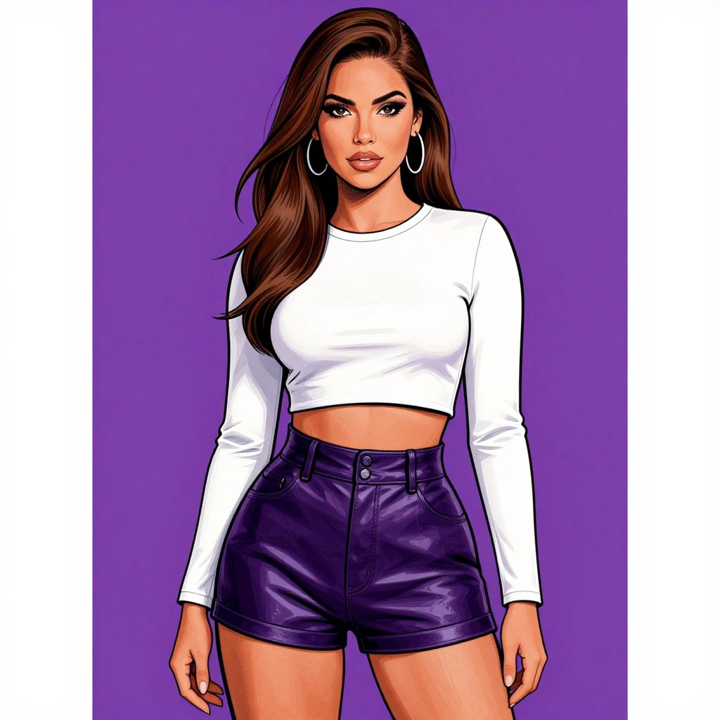 This is a digital illustration of a young woman with long, wavy brown hair and light olive skin. She has bold, dark eyebrows and full, pink lips. She wears a white, long-sleeve, cropped top that reveals her midriff and high-waisted, dark purple leather shorts. Her large, silver hoop earrings add a touch of elegance. The background is a solid, vibrant purple, making her white top and dark shorts stand out prominently. The illustration style is crisp and clean, with bold colors and sharp lines, giving it a modern, comic-book feel.