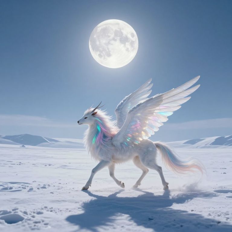 Envision an ethereal dreamscape where a mythical creature roams through a vast, snow-white expanse under the luminous gaze of a colossal moon. This majestic being moves with grace and tranquility across the barren landscape, its iridescent mane and translucent wings reflecting the soft lunar light in a mesmerizing dance of shadows upon the stark terrain. From an elevated perspective, as if gazing through the lens of a dreamer's eye, this scene unfolds with a sense of wonder, solitude, and the captivating allure of the unknown, reminiscent of surreal landscapes that embody the essence of dreamlike visions.