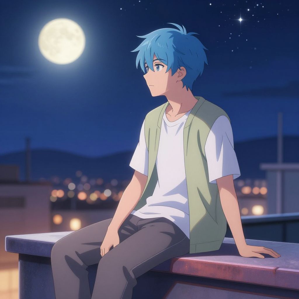 Anime man with blue hair sitting on a rooftop under a starry sky, wearing casual modern clothes, softly illuminated by moonlight, serene expression, soft pastel color palette with a blend of cool and warm tones, detailed background with distant city lights