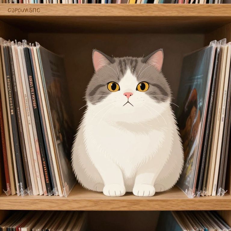 "Drawing comic-style, surreal, fluffy fat cat on a record shelf, vivid but muted colors, leave negative space,"