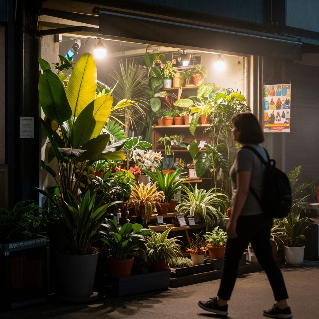 Photograph of a brightly lit urban plant shop at night, with a woman in a grey shirt and backpack walking by, large potted plants, and