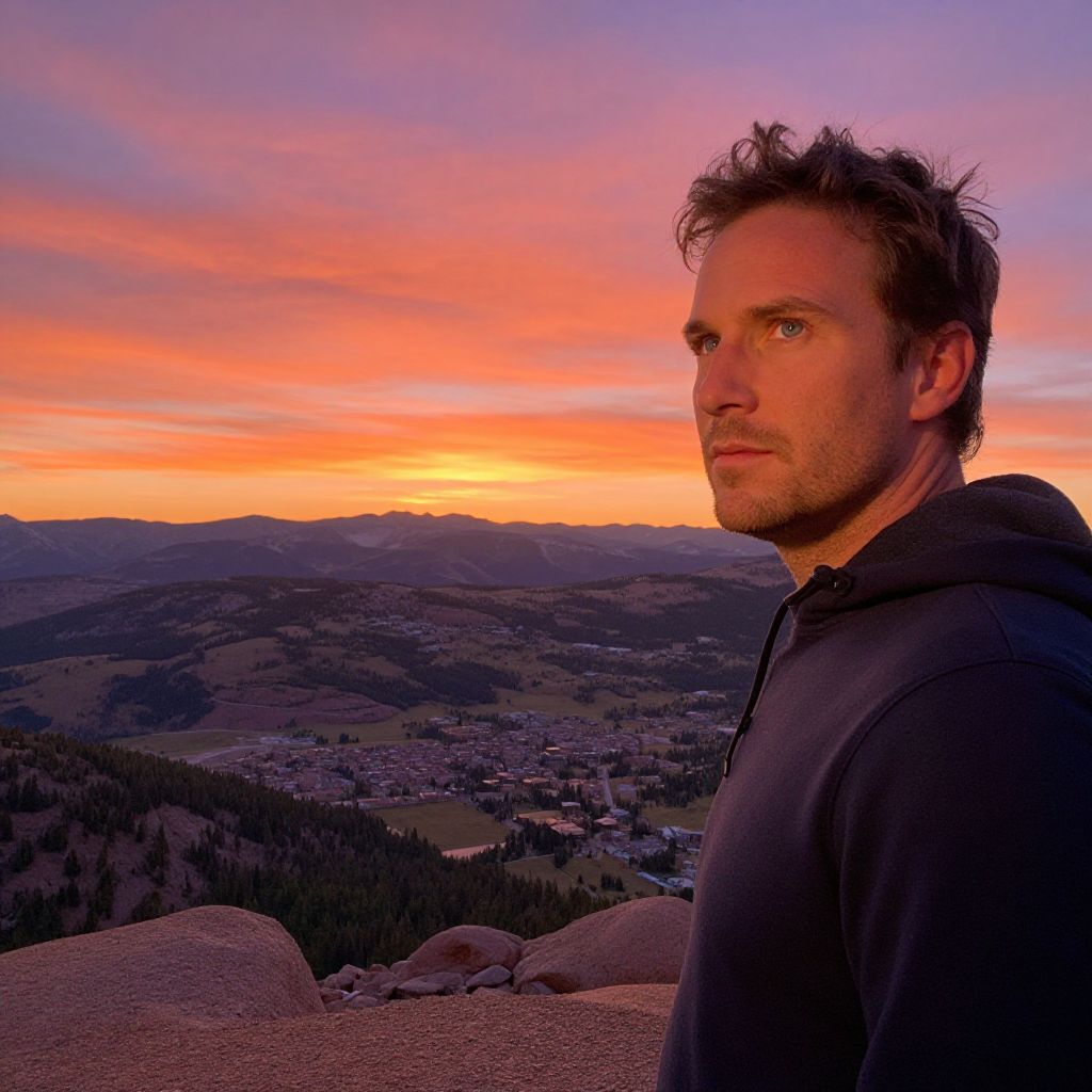 Majestic, rugged terrain unfolds beneath his triumphant stance, as he gazes out upon the breathtaking vista of Boulder, Colorado's Rocky Mountains. Vibrant colors dance across the sky, a kaleidoscope of oranges, pinks, and purples, illuminated by the golden hour's warm rays. Softly lit, his determined expression con Man has masculine face and piercing eyes