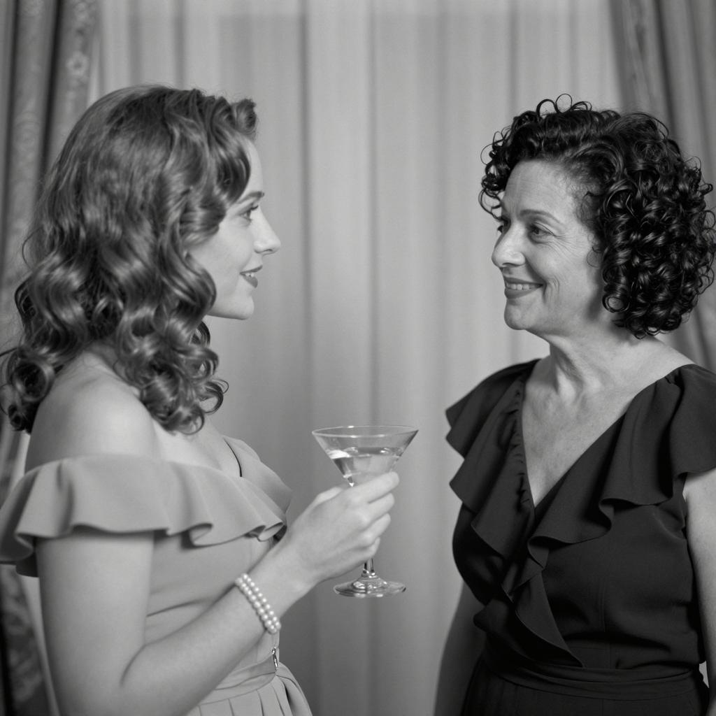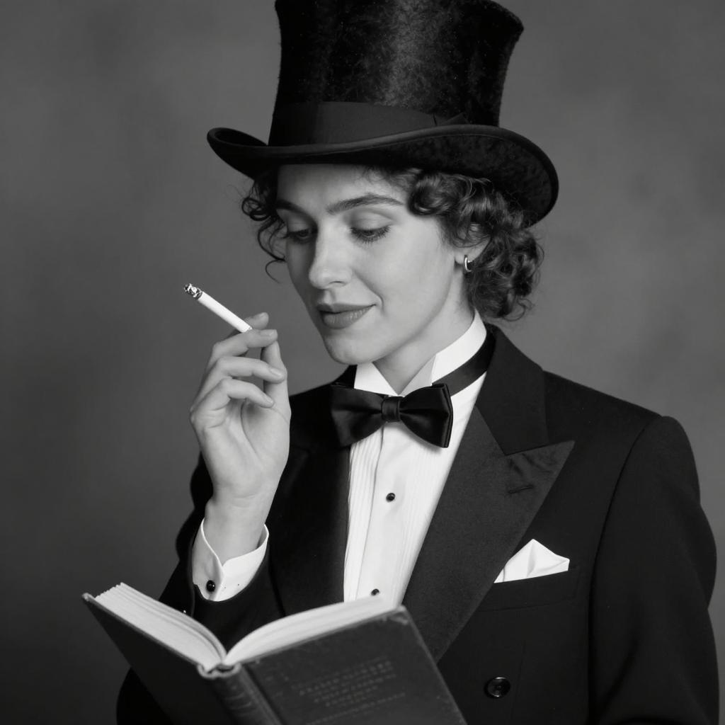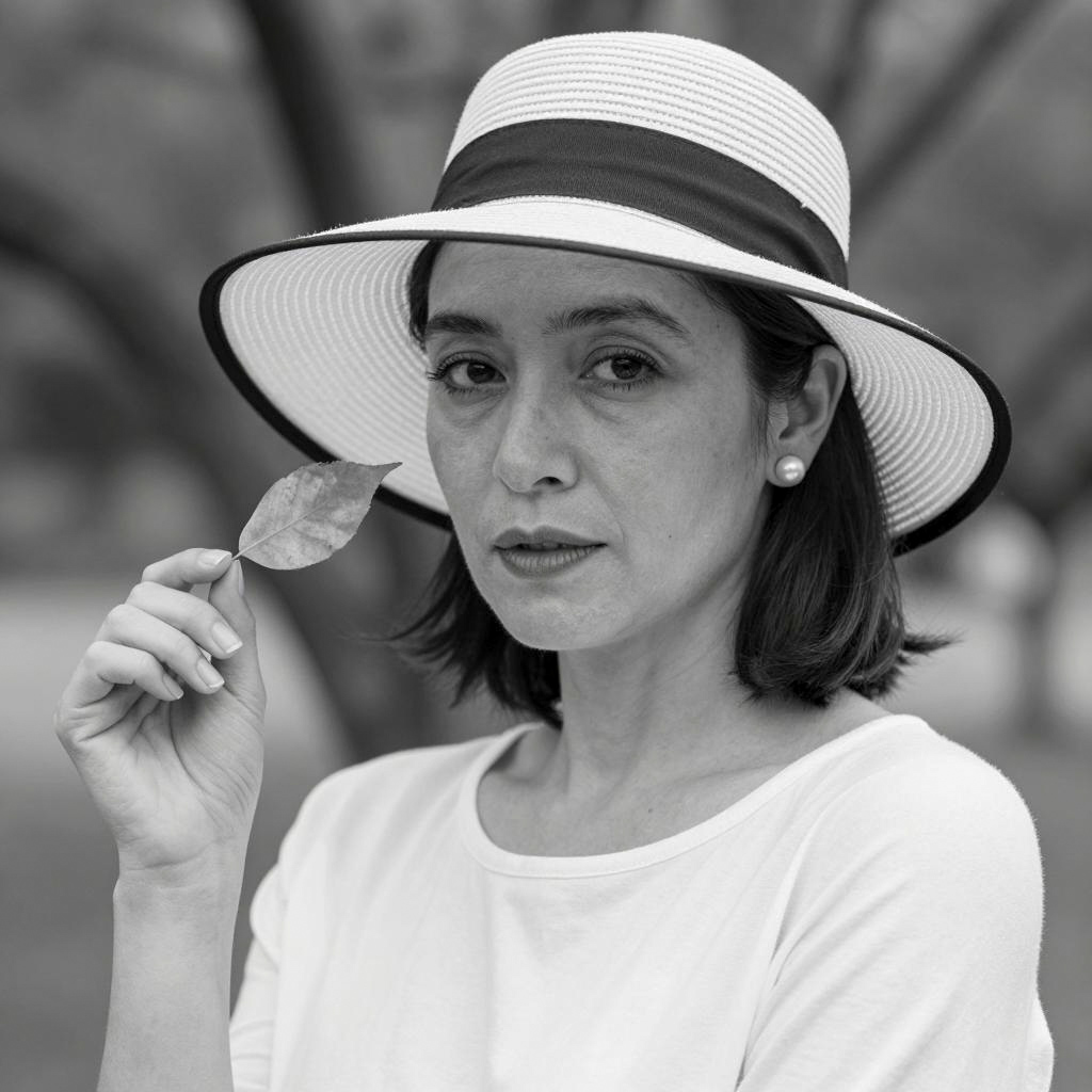 Black and white photograph of a man with a large mustache, wearing a wide-brimmed hat, occupying the background. In the foreground, a woman in a dark suit and white shirt stands behind a wooden lectern, smiling, with her right hand gesturing towards the large portrait of the man. Three people are partially visible on the right side.