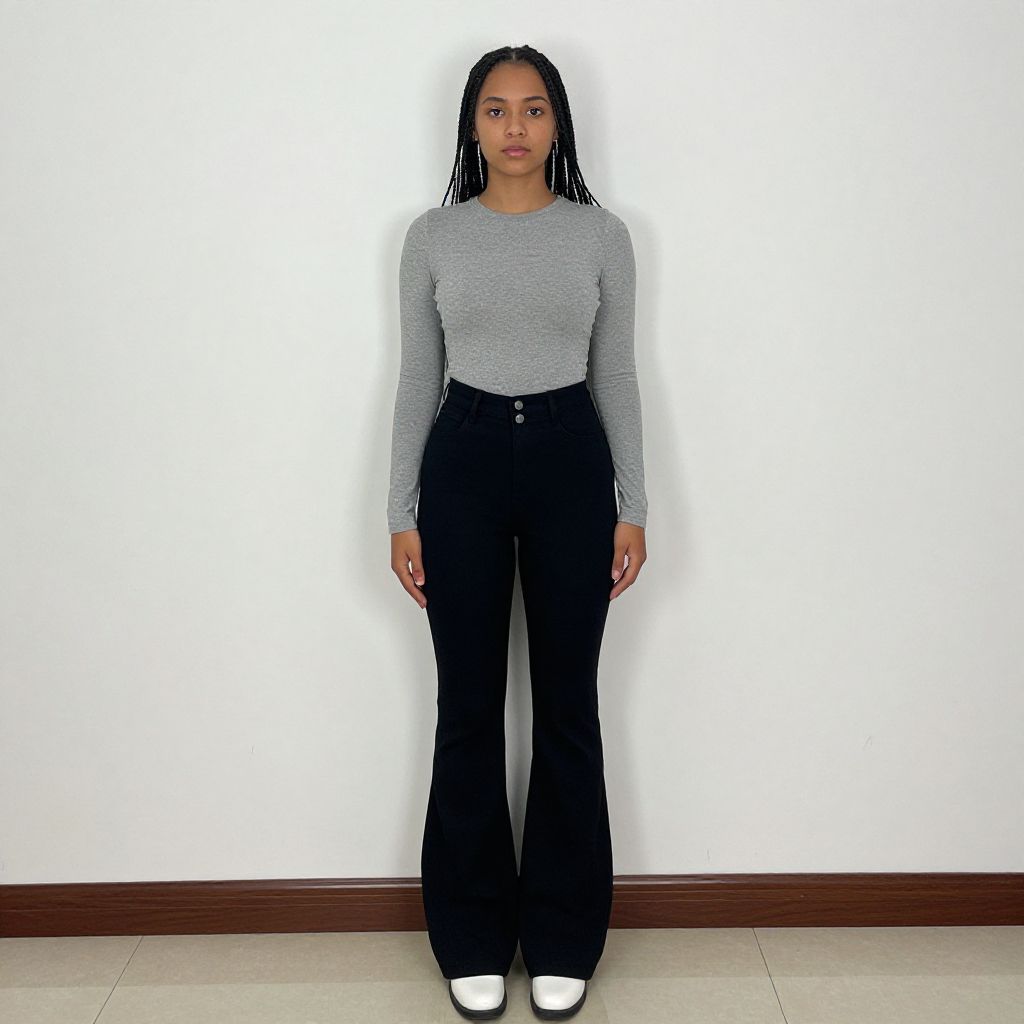 Photograph of a young woman standing against a plain white wall with a dark brown baseboard. She has long, black braided hair, medium brown skin, and is wearing a tight, long-sleeve, grey top paired with high-waisted, black, flared pants. She has white shoes and is looking directly at the camera with a neutral expression. The floor is tiled in a light color.