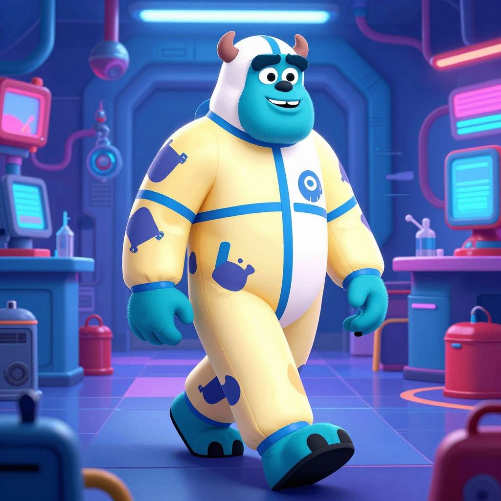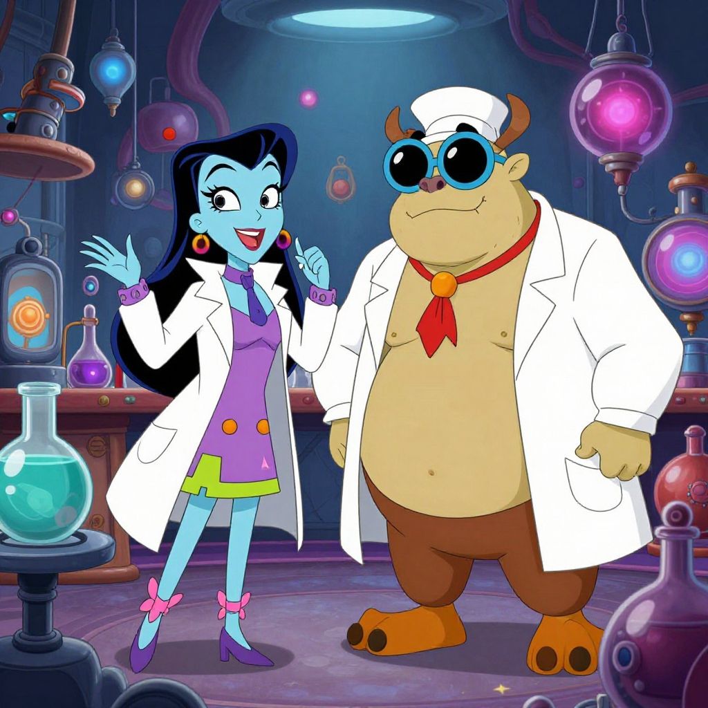 Character design of YZMA and Kronk lab costumes, combining villainous and comedic styles, detailed cartoon render with bright and bold color schemes, mysterious laboratory environment filled with vintage scientific equipment and magical artifacts, playful and surreal mood