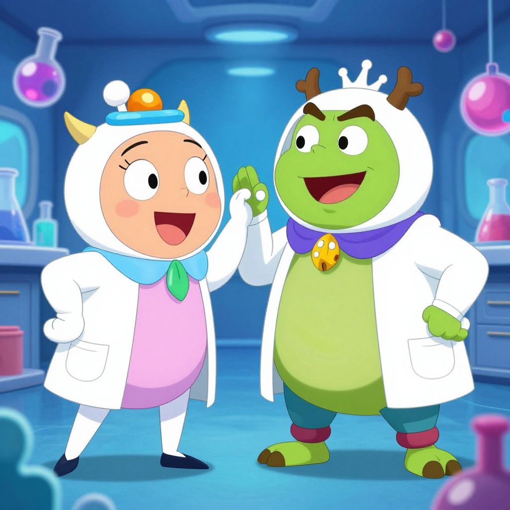 This digital cartoon image features two anthropomorphic characters in a laboratory setting. On the left, a black-and-white skunk with wide eyes, wearing a yellow vest, blue bowtie, and white lab coat, holds up a test tube with a pink liquid. On the right, a green, muscular ogre with small horns, an orange necktie, and white lab coat, stands with a confident expression. The background includes a blue wall, various laboratory equipment, and colorful glass beakers and flasks. The image has a vibrant, animated style with bold colors and smooth textures.