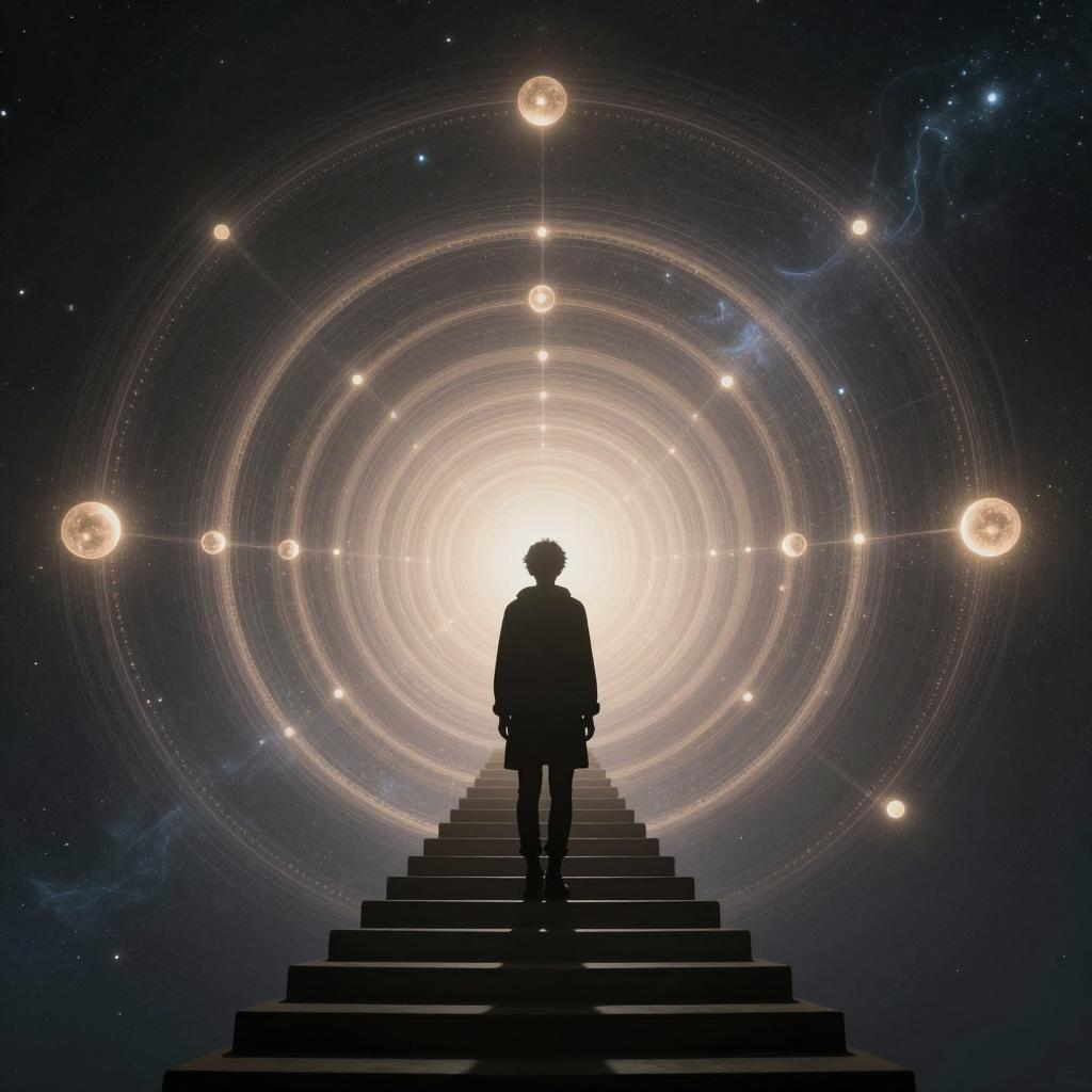 A silhouette of a person standing on a staircase leading into a luminous, circular labyrinth filled with glowing orbs and intricate, radiant patterns. The scene symbolizes a passage into a celestial, otherworldly dimension of light and harmony, capturing a futuristic and spiritual atmosphere.