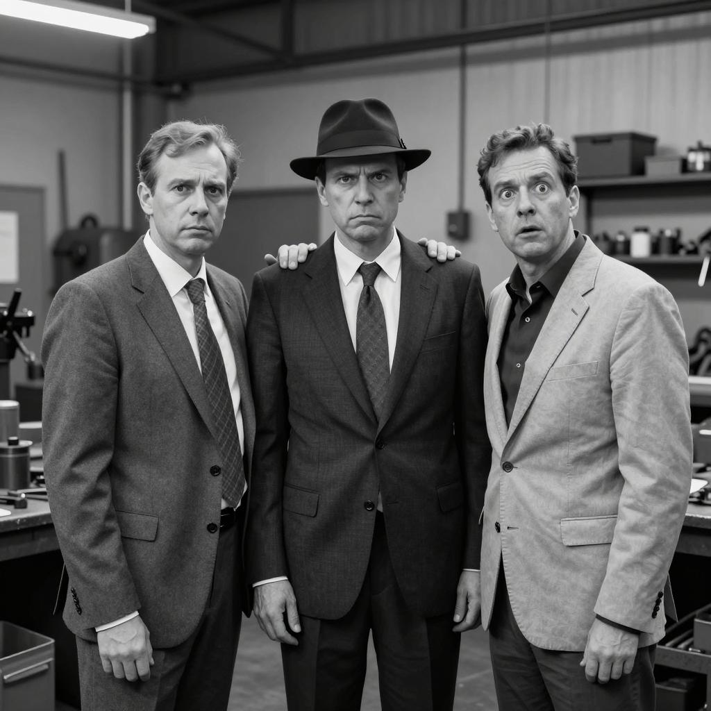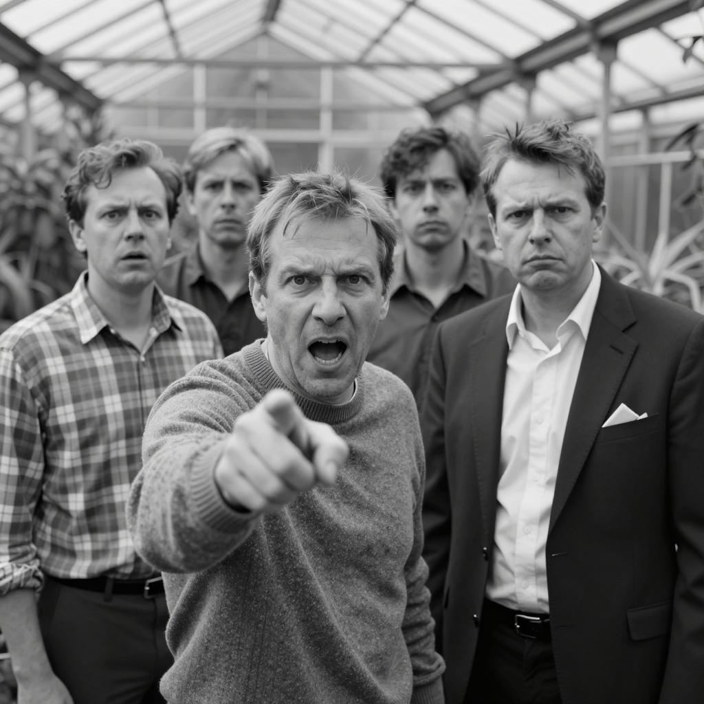 Black and white photograph of five men in a greenhouse. Foreground: middle-aged man in sweater pointing aggressively, mouth open. Right: man in suit with pocket square, intense expression. Background: three men, one with checkered shirt, surprised expressions. Greenhouse with plants, arches, and blurred background. Shadows cast on faces.