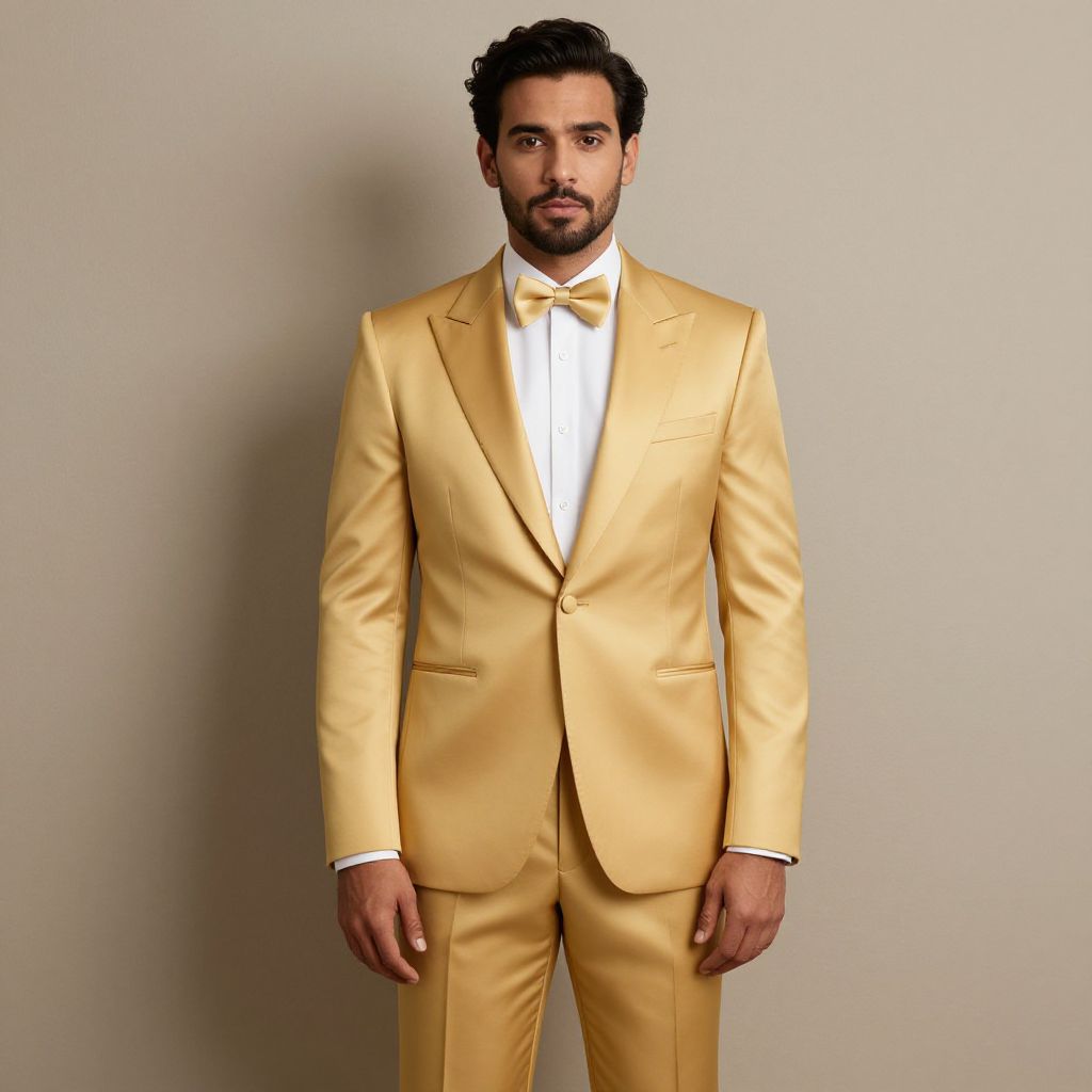 Photograph of a man with medium brown skin and short, curly black hair, and a trimmed beard, standing against a plain, light beige background. He is wearing a shiny, golden-yellow satin suit with a white dress shirt and a matching golden-yellow bow tie. His expression is neutral, and his arms are relaxed by his sides. The suit has a classic fit with a single-breasted jacket and straight-leg trousers. The lighting is even, highlighting the texture of the satin fabric and the smoothness of his skin.