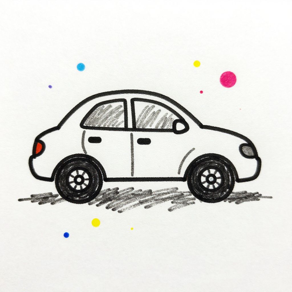 A digital drawing of a white, side-view, cartoon-style car with black wheels and minimalistic black outlines. The car has simple, rounded shapes and features small black windows and door handles. It sits on a gray shadow beneath, adding a sense of depth. The background is white with scattered colorful dots in blue, yellow, and red, adding a playful and whimsical touch. The drawing style is reminiscent of children's book illustrations, with a focus on bold lines and simple forms.