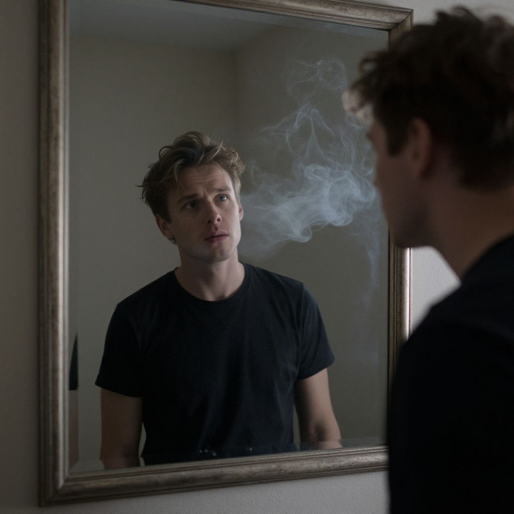 Photograph of a young Caucasian man with tousled brown hair and a slightly serious expression, standing in front of a rectangular mirror. He wears a simple black T-shirt and looks at his reflection. A plume of white smoke rises from his right side, partially obscuring his face in the mirror. The background is dimly lit, with a neutral-colored wall and a hint of a window on the right. The mirror has a silver frame, and the overall mood is moody and introspective.