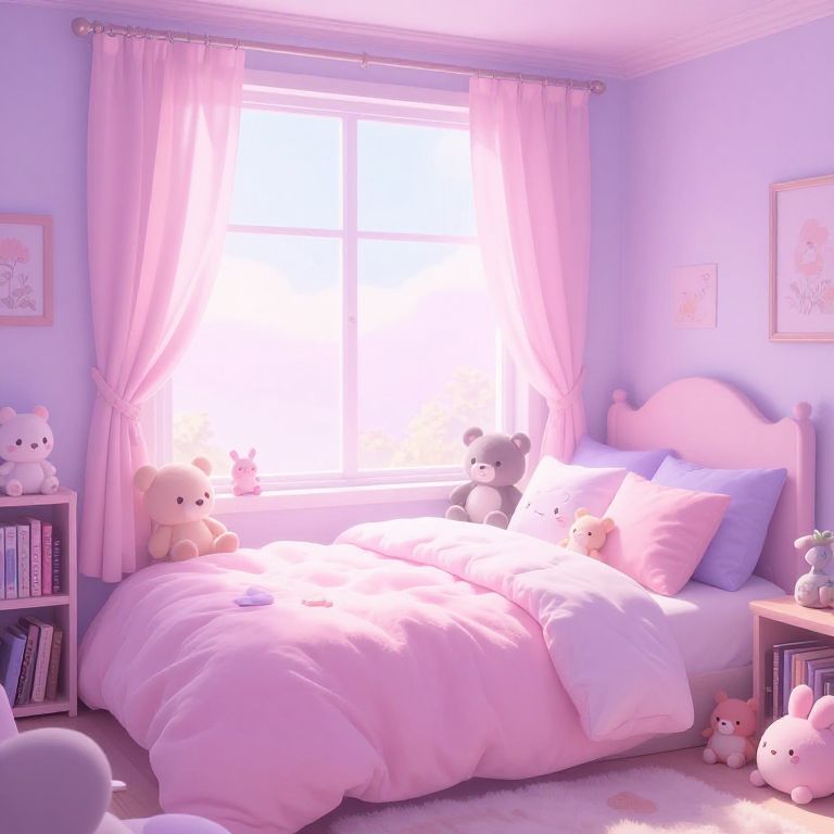 Anime style bedroom, dreamy pastel pink and lavender tones, large window with flowing curtains, bed with fluffy comforter and lots of stuffed animals, a small bookshelf with fantasy novels, cozy and whimsical vibe, soft shading and detailed textures