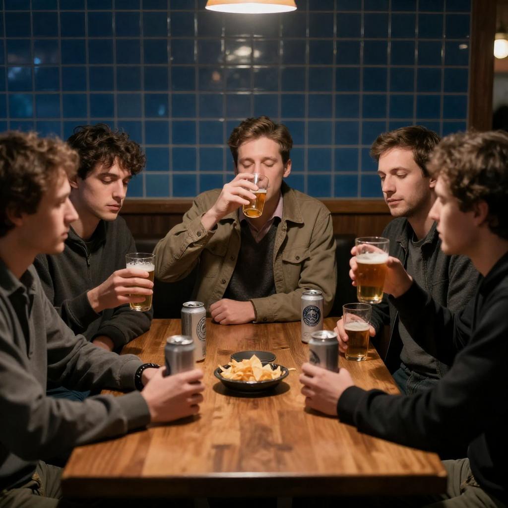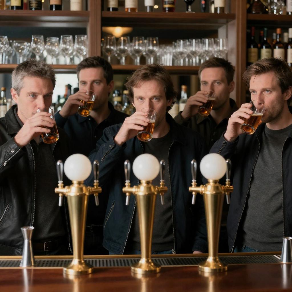 Photograph of five middle-aged men drinking from glasses of amber liquid at a bar. They stand in a row, each holding a glass to their lips. They wear various dark jackets and have short to medium-length hair. Gold and white beer taps are in front of them. Shelves with glassware are in the background. Men have neutral expressions. Bar setting.