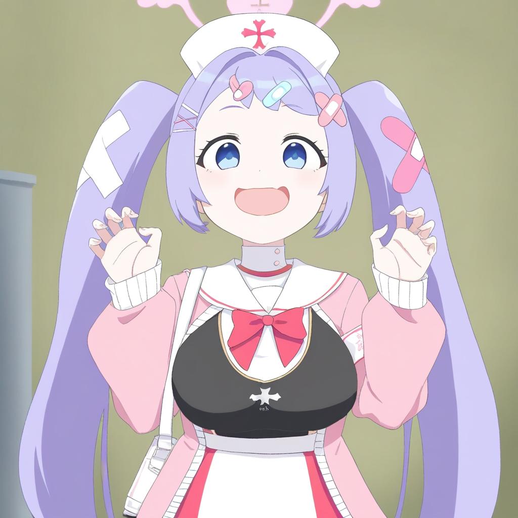Hanae (blue archive), blue archive, 1girl, skin fang, blue eyes, purple hair, very long hair, long hair, bandaid hair ornament, twintails, hairclip, large breasts, nurse cap, halo, pink halo, long sleeves, by artist yoshida keiji, leet