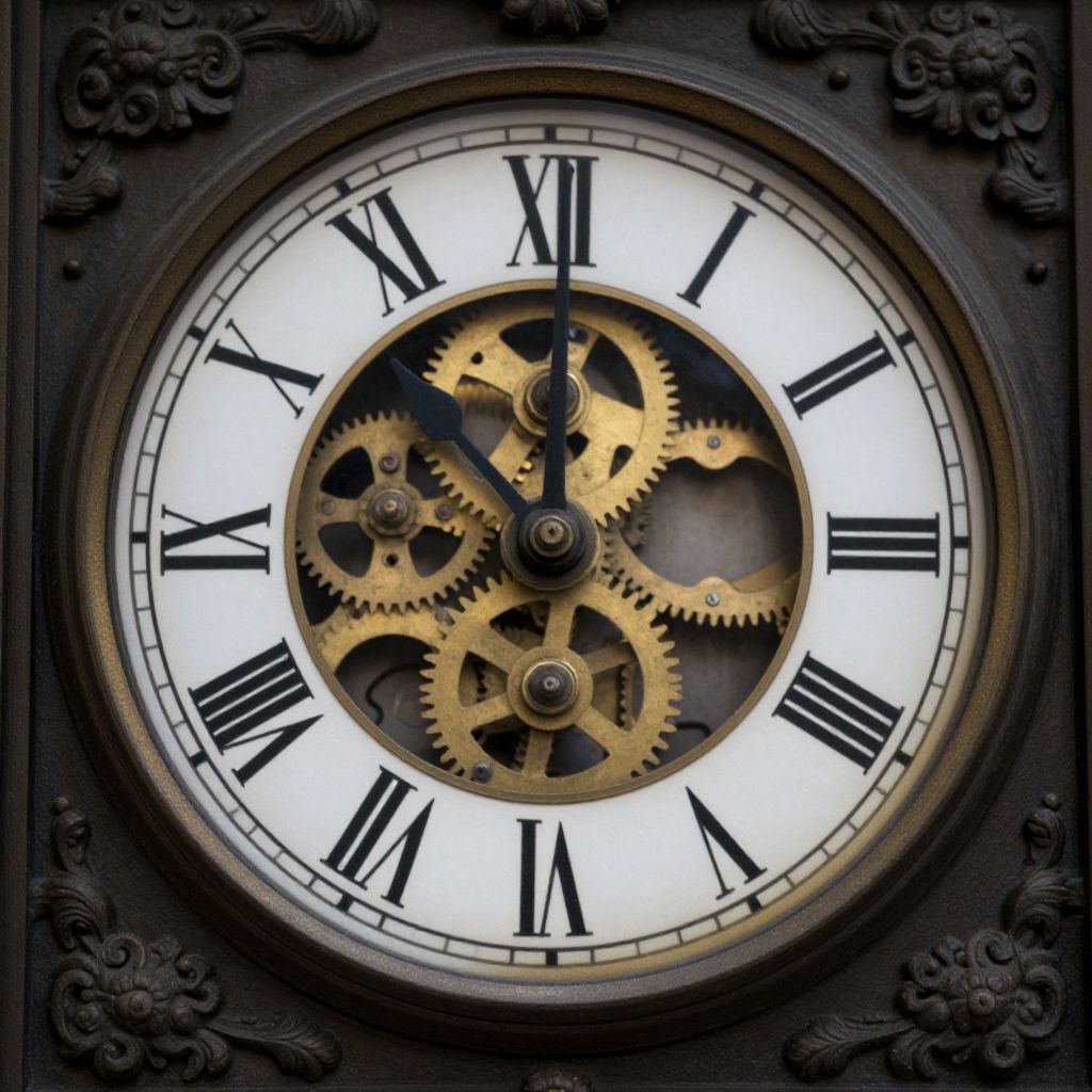 An antique clock whispers the paradox of time, its exposed gears and Roman numerals embodying the eternal dance between order and chaos, while its vintage charm invites contemplation on the fluidity of moments and the weight of memory.